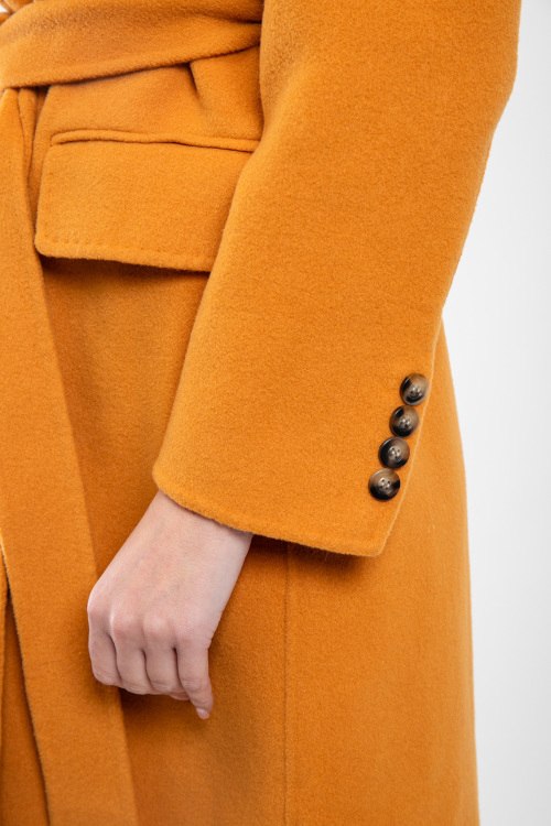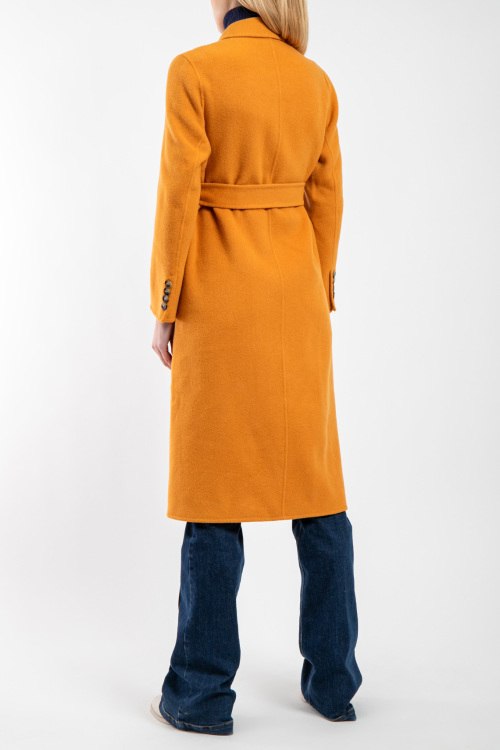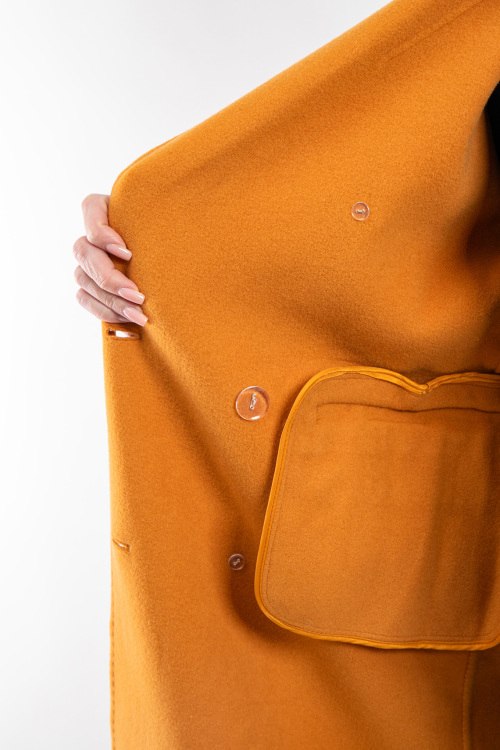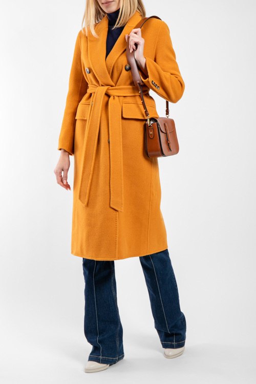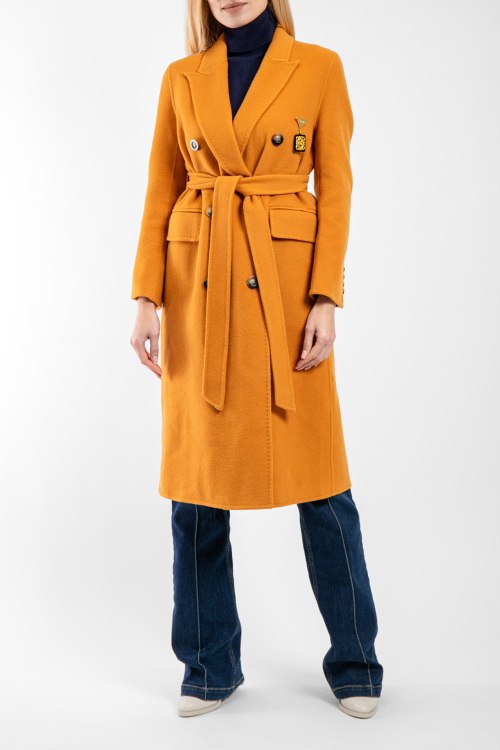 Женское рыжее шерстяное пальто от Loewe (Лоэйве). Двубортный фасон, отложной воротник с заостренными лацканами, передние карманы с клапаном, застежка на пуговицы, длина-миди. Подвеска-брошка не идет в комплекте, использована для стилизации образа. На модели снят размер - M. Параметры модели: 177 см, 88-63-91 см