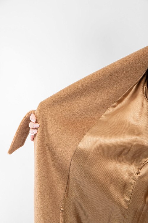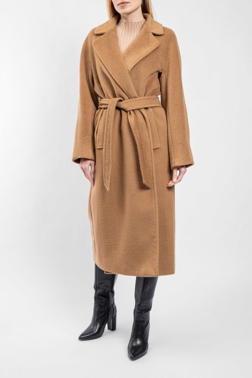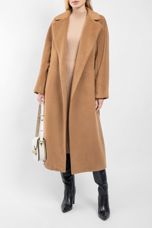 Женское пальто цвета кэмел из шерсти и альпаки Tempera от Max Mara Weekend (Макс Мара Викенд). Отложной воротник, боковые карманы, в талии с поясом, длина-миди.