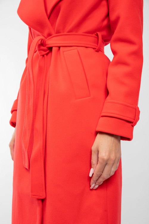 Женское красное пальто от Lascana (Ласкана). Объемный отложной воротник с заостренными лацканами, боковые карманы, в талии с поясом, застежка на кнопку, длина-миди.