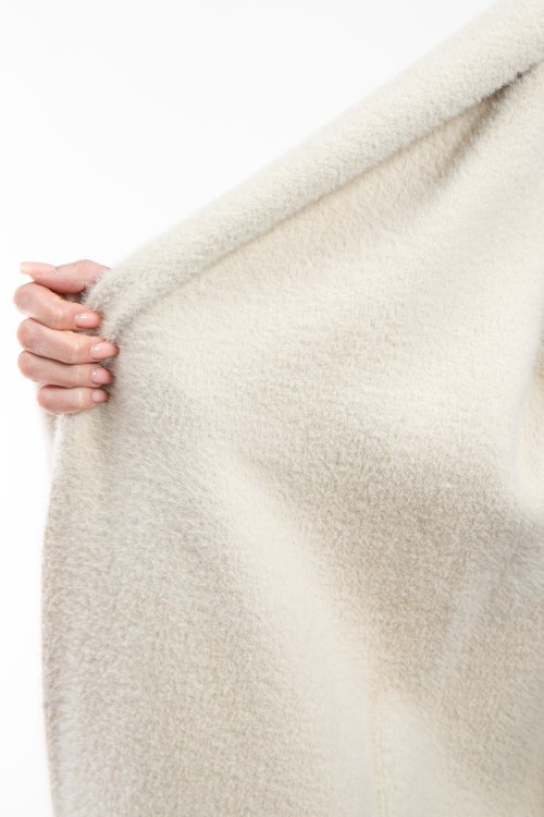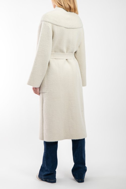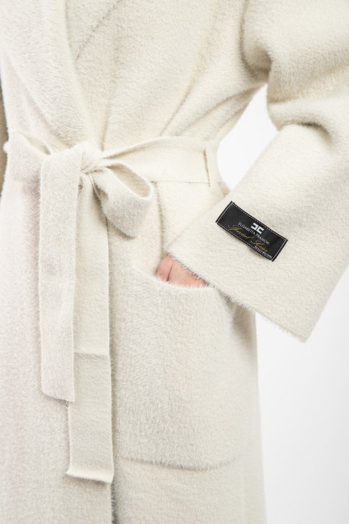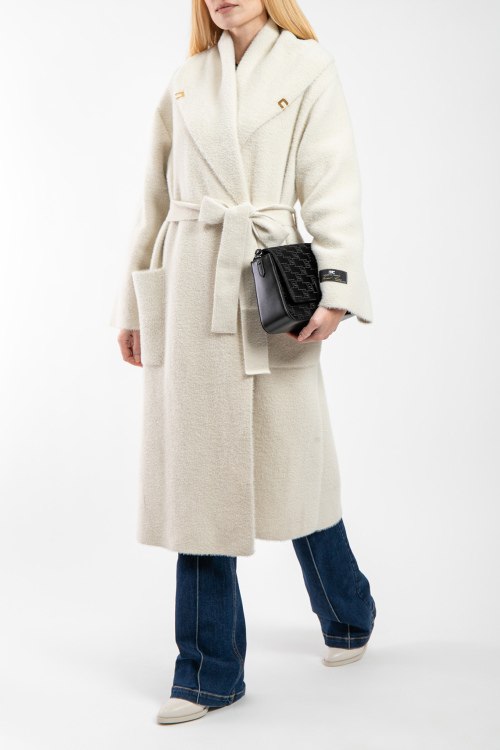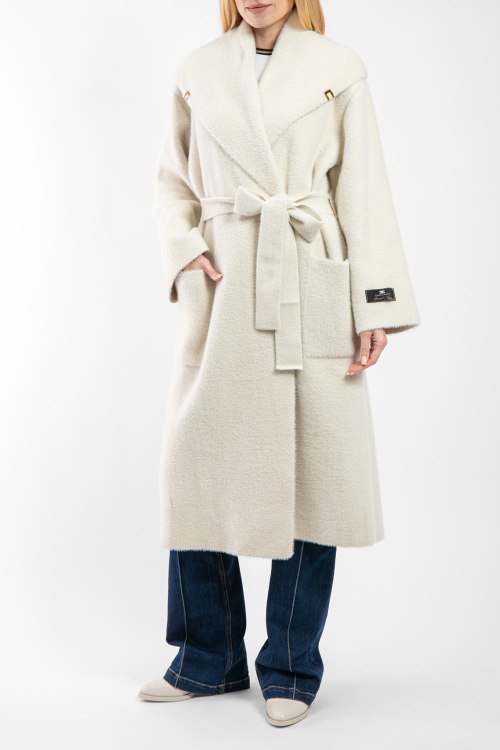 Женское пальто молочного оттенка от Elisabetta Franchi (Елизабетта Франчи). Модель на запах, объемный отложной воротник, нашивка с логотипом на рукаве, в талии с поясом, передние карманы, длина-миди.
