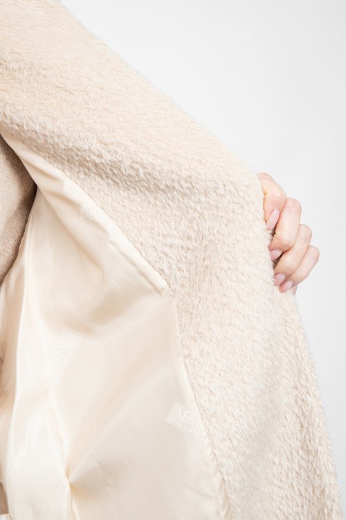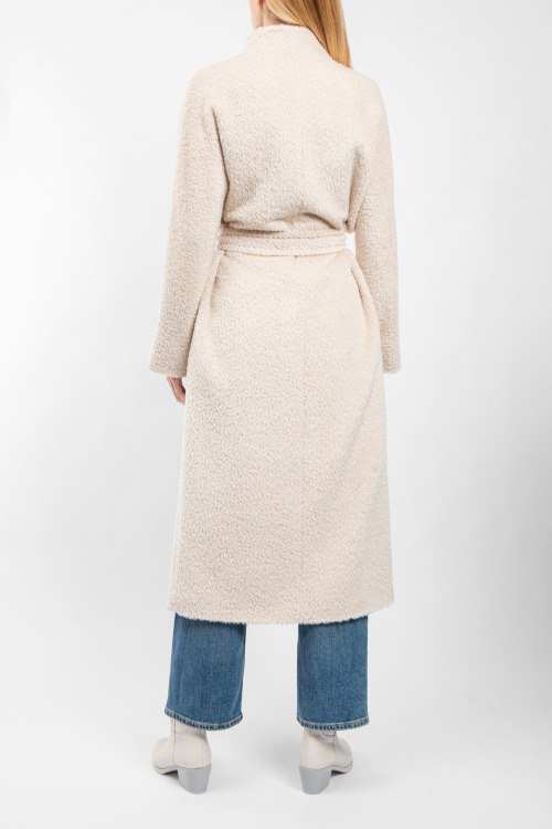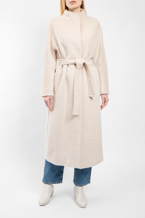 Женское кремовое пальто из альпаки и шерсти Ferito от Max Mara Studio (Макс Мара Студио). Воротник-стойка, боковые карманы, в талии с поясом, длина-миди.
