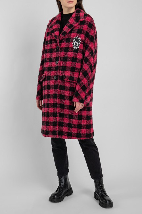 Женское красное пальто из шерстяного микса от Ermanno Scervino (Эрманно Шервино). Длина до колена, отложной воротник, застежка на пуговицы на уровне груди, два кармана с клапаном, нашивка на груди