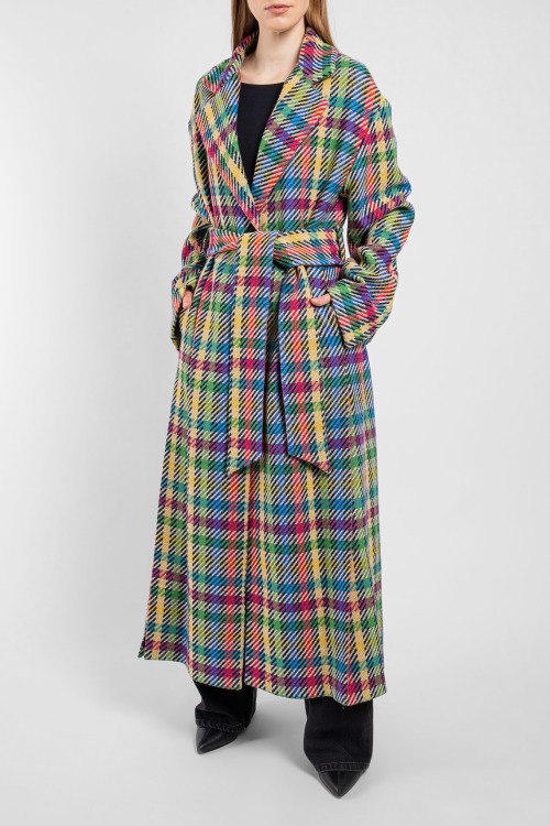 Женское пальто из микса шерсти и хлопка от Attico (Аттико). Длина миди, дизайн в разноцветную клетку, застежка на пуговицы ниже груди, отложной воротник, закругленный лацканы, широкий пояс в тон изделия, по бокам разрезы, прорезные карманы, модель на подкладке из вискозы черного цвета