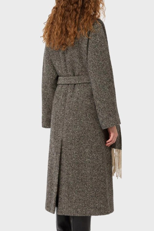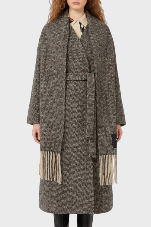 Детали: Женское серое шерстяное пальто с шарфом Zenica от Max Mara Weekend (Макс Мара Викенд). Модель без воротник, узор-елочка, боковые карманы, в талии с поясом, длина-миди. Съемный длинный шарф, нашивка логотипа, края с бахромой