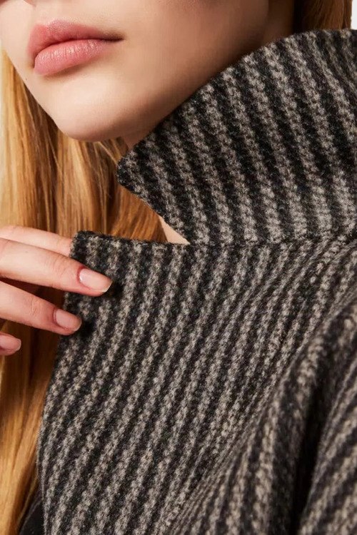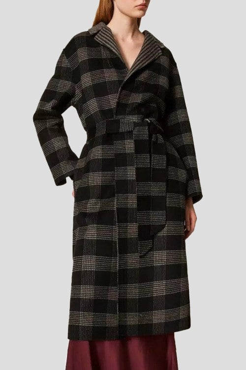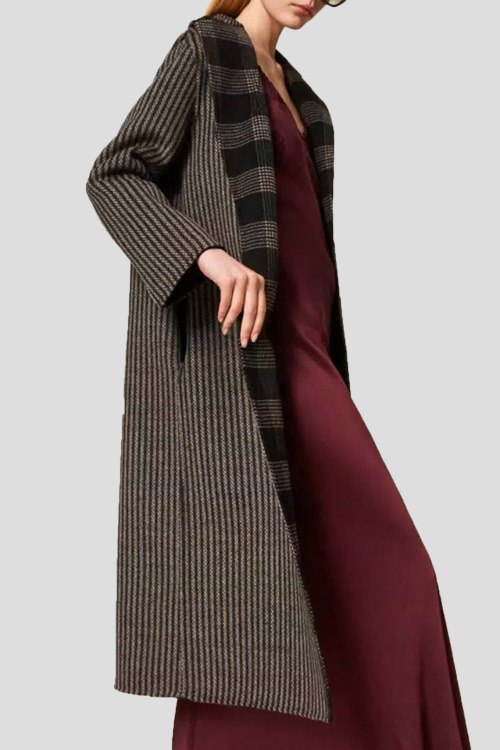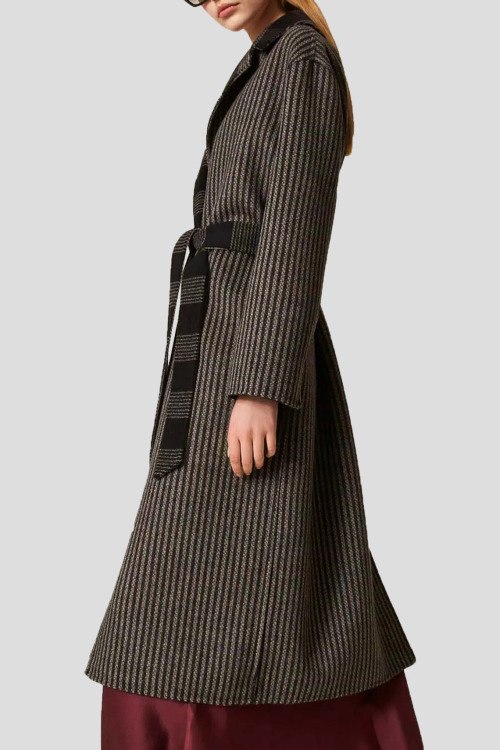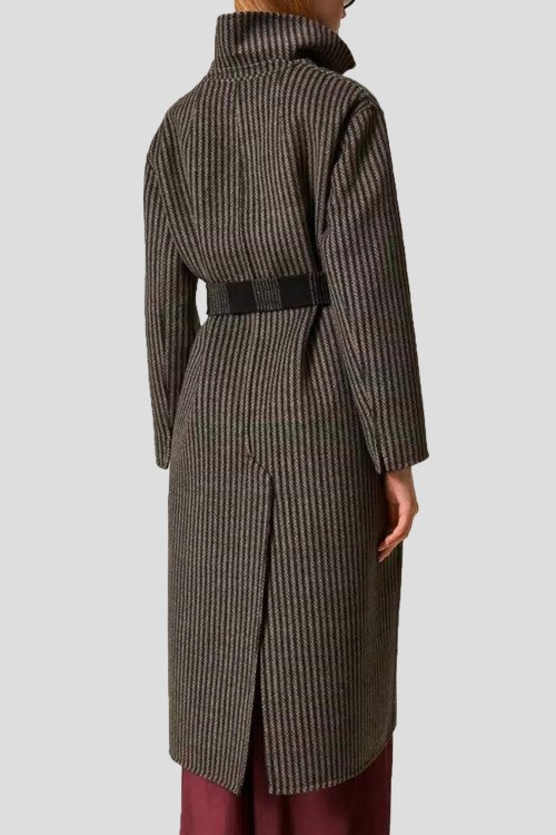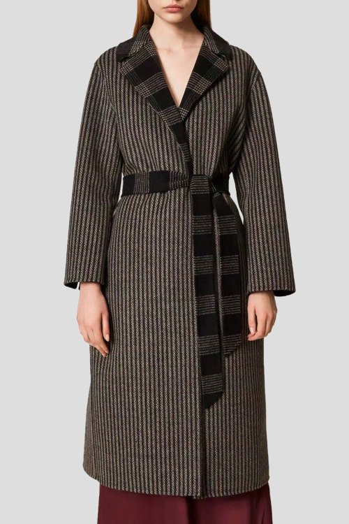 Детали: Женское серое двухстороннее шерстяное пальто от TWINSET (Твинсет). Одна сторона в клетку, вторая в полоску. Отложной воротник, в талии с поясом, боковые карманы, длина-миди