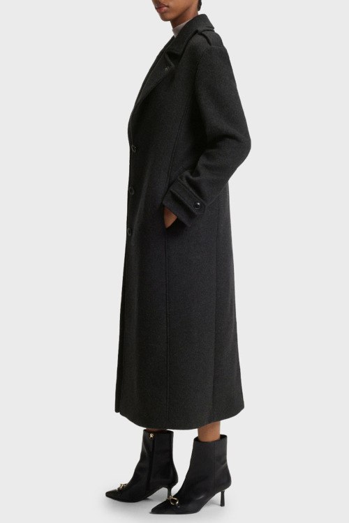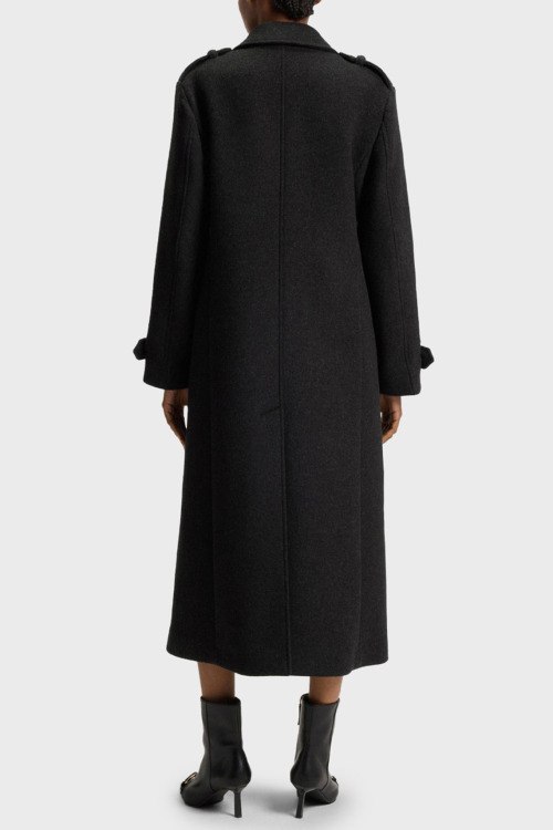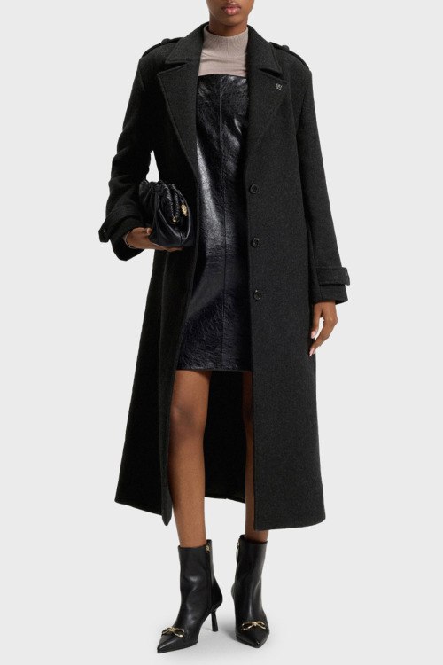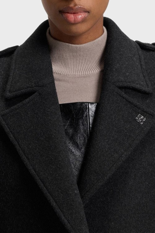 Детали: Женское темно-серое шерстяное пальто Milehe от Hugo by Hugo Boss (Хуго бай Хуго Босс). Отложной воротник, погоны на плечах, значок логотипа, боковые карманы, застежка на пуговицы, длина-миди