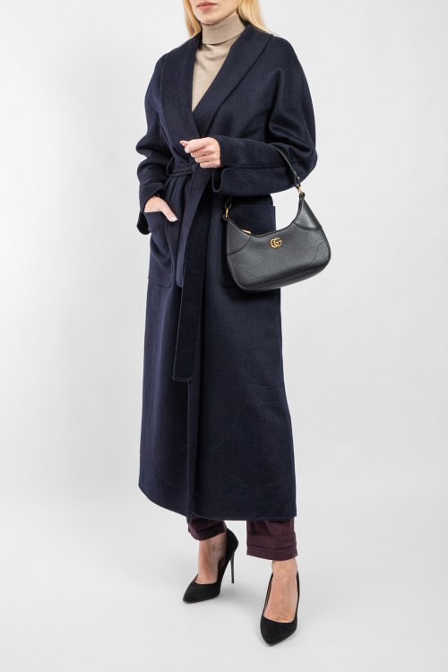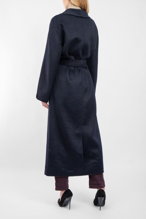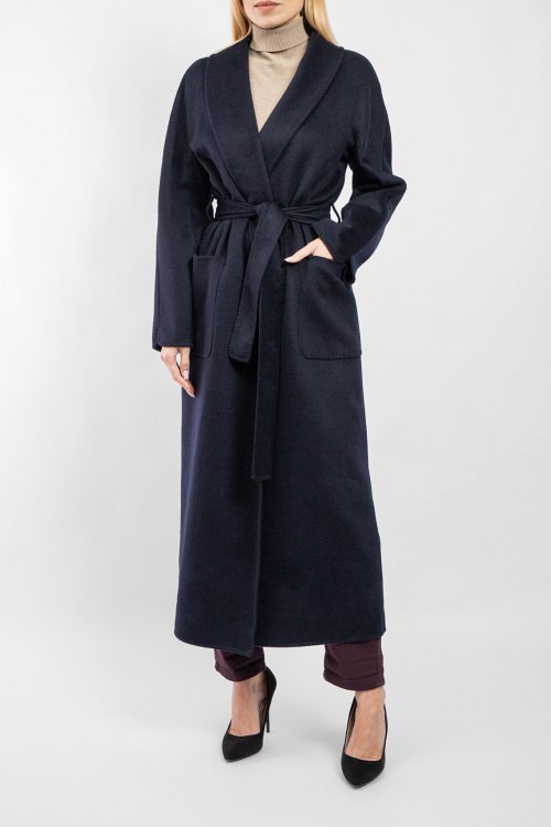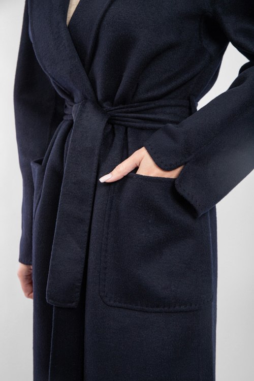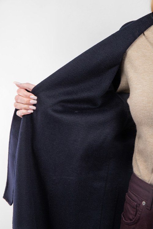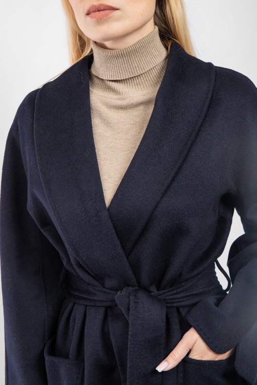 Женское темно-синее пальто из шерстяного микса от Vicolo (Виколо). Модель на запах, отложной воротник, два накладных кармана, в талии пояс в тон изделия, длина-миди. Замеры для размера L: длина: 133 см, ширина груди 57 см, ширина по талии 58 см, ширина по бедрам: 60 см длина по внутреннему шву рукава 46 см, ширина рукава 20,5 см.