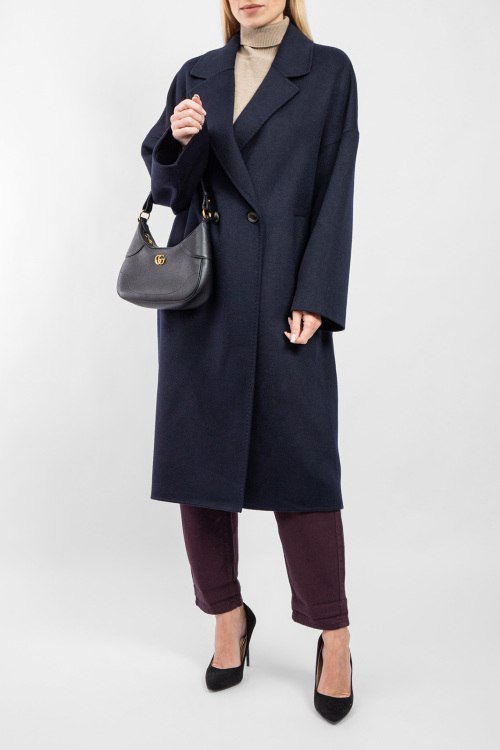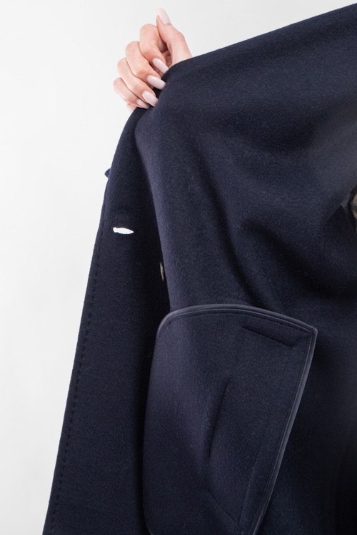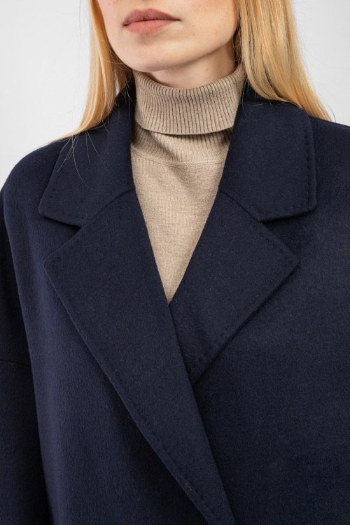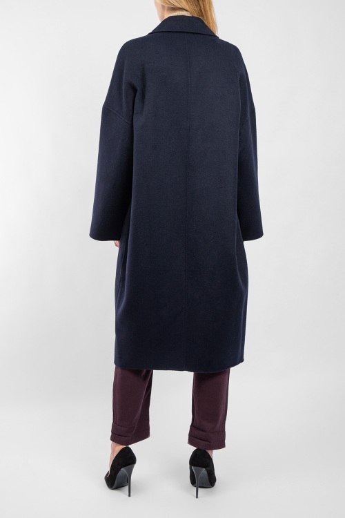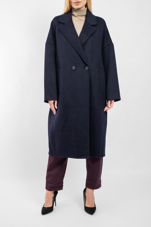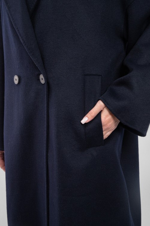 Женское темно-синее пальто из шерстяного микса от Vicolo (Виколо). Двубортный фасон, отложной воротник с заостренными лацканами, боковые карманы, застежка на пуговицы, длина-миди. Замеры для размера L: длина: 114 см, ширина груди 61 см, ширина по талии 64 см, ширина по бедрам: 66 см длина по внутреннему шву рукава 38 см, ширина рукава 23 см.