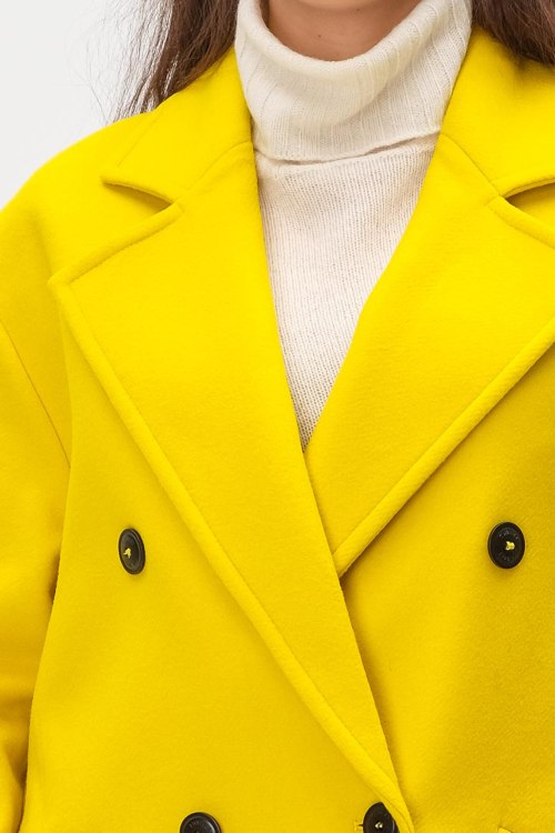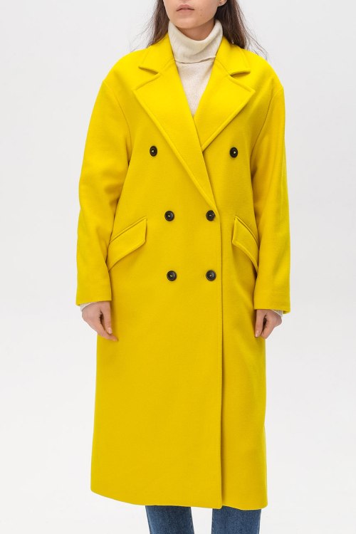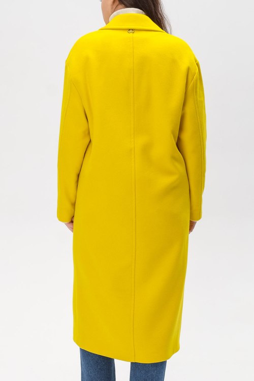 Женское желтое пальто из шерсти и полиамида от TWINSET (Твинсет). Двубортная модель, прямой крой, воротник с лацканами, застегивается на пуговицы, два кармана с клапанами