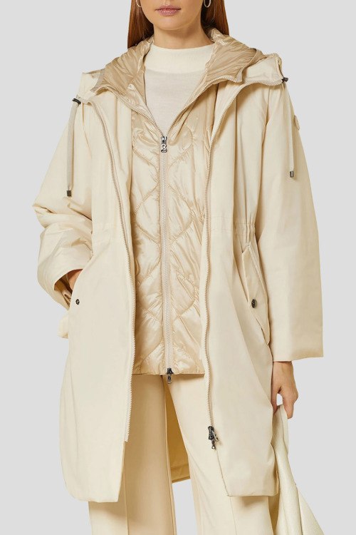Детали: Женская бежевая парка Roxane-T из полиэстера от Bogner (Богнер). Удлиненная модель, вшитый капюшон с кулиской, застежка на молнию, съемная стеганая подкладка, кулиска на поясе, фигурный низ изделия, прорезные карманы, длинные рукава-реглан