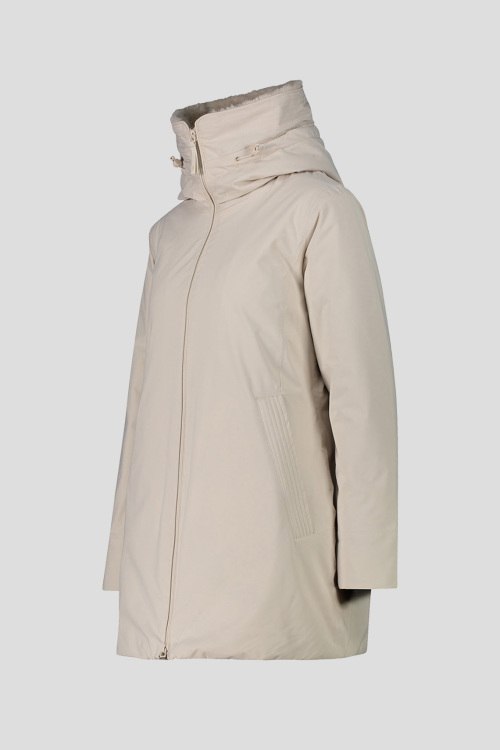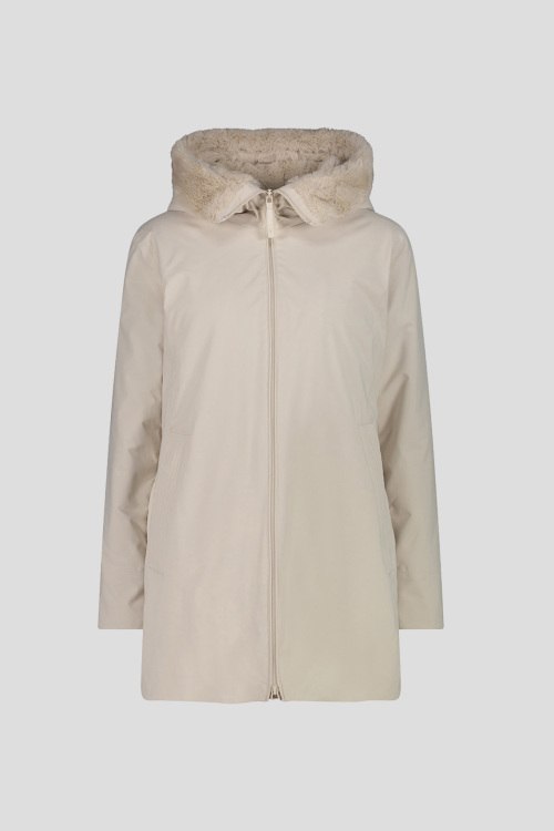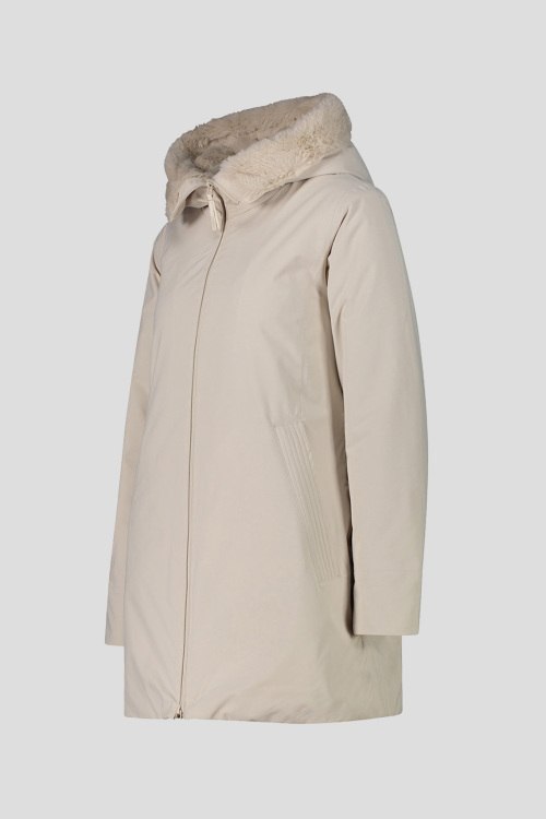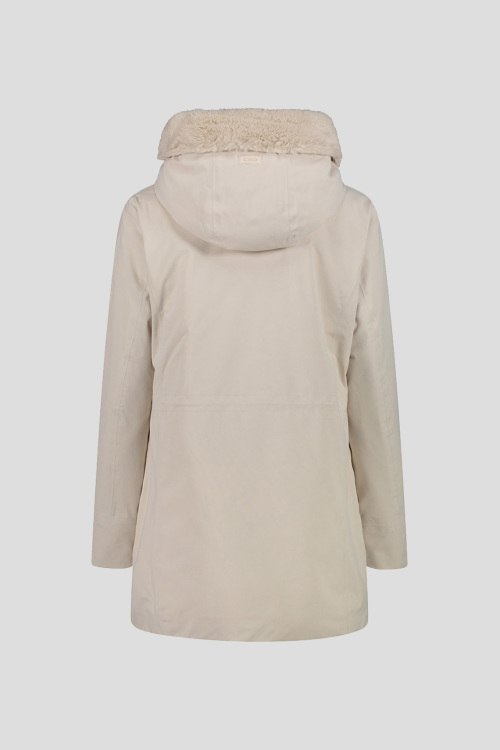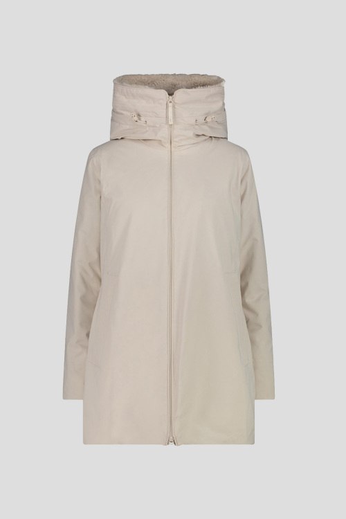 Детали: Женская бежевая парка Fix Hood Twill от CMP (СМП). Удлиненная модель, высокий воротник-стойка, застежка на молнию, вшитый капюшон с утяжкой, прорезыне карманы, логотип бренда, меховая подкладка