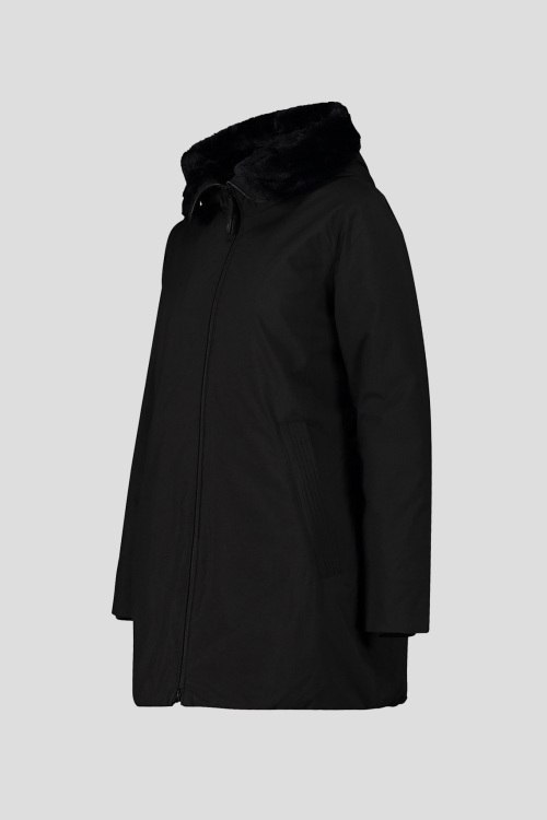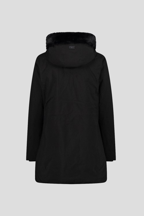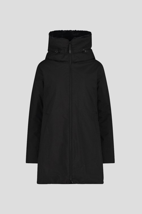 Детали: Женская черная парка Fix Hood Twill от CMP (СМП). Удлиненная модель, высокий воротник-стойка, застежка на молнию, вшитый капюшон с утяжкой, прорезыне карманы, логотип бренда, меховая подкладка