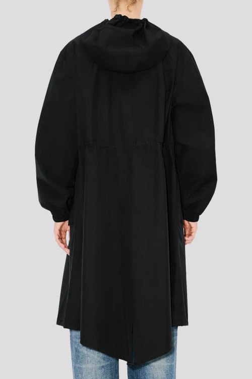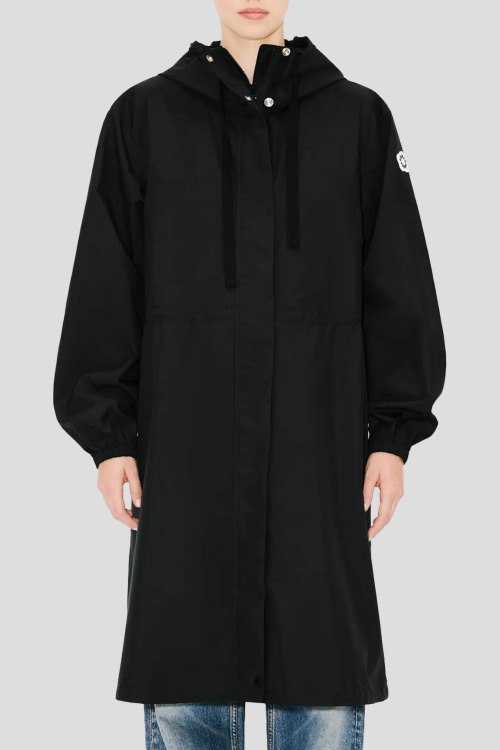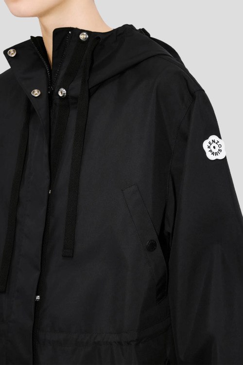 Детали: Женская черная парка Boke Flower 2.0 от Kenzo (Кензо). Вшитый капюшон, нашивка с логотипом на рукаве, боковые карманы, в талии на кулиске, застежка на молнию и кнопки, длина-миди