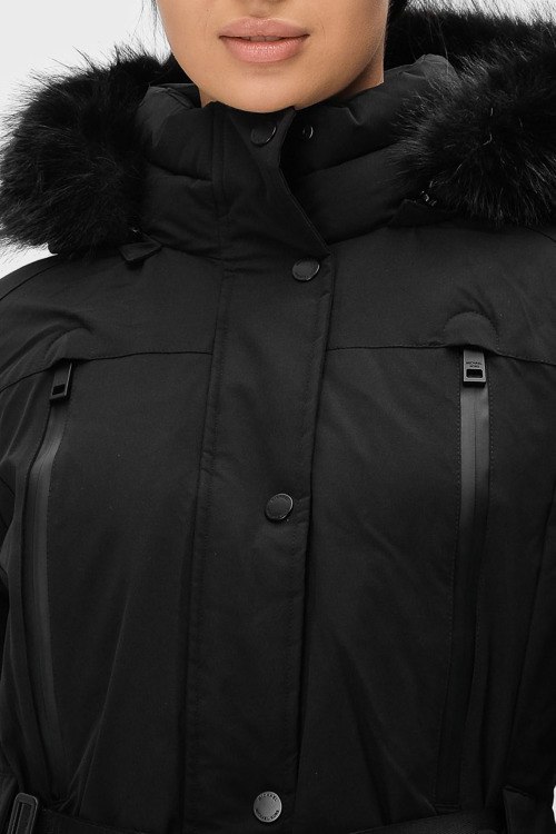 Женская черная парка от Michael Kors (Майкл Корс). Съемный капюшон с отделкой из искусственного меха, четыре передних кармана, нашивка с логотипом на рукаве, в талии брендированный пояс в тон изделия, застежка на молнию и кнопки, длина выше колен