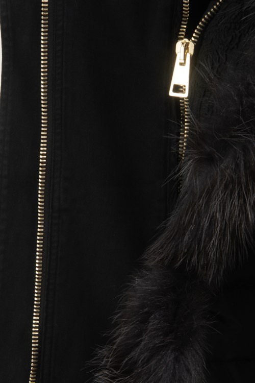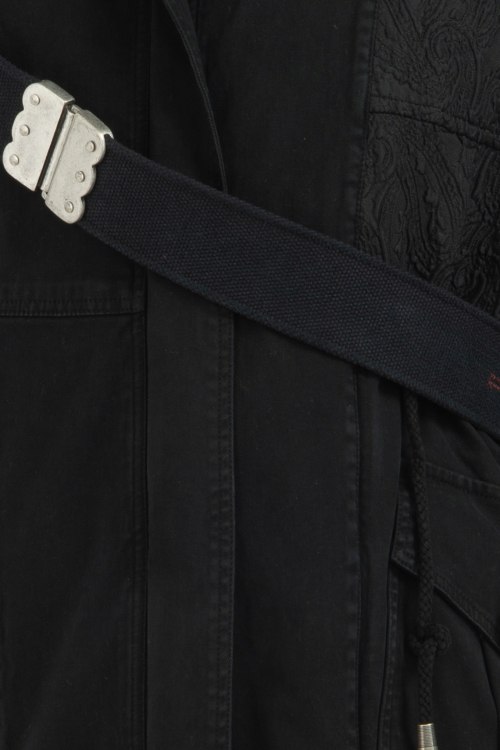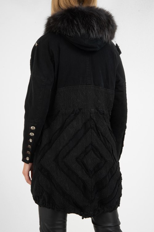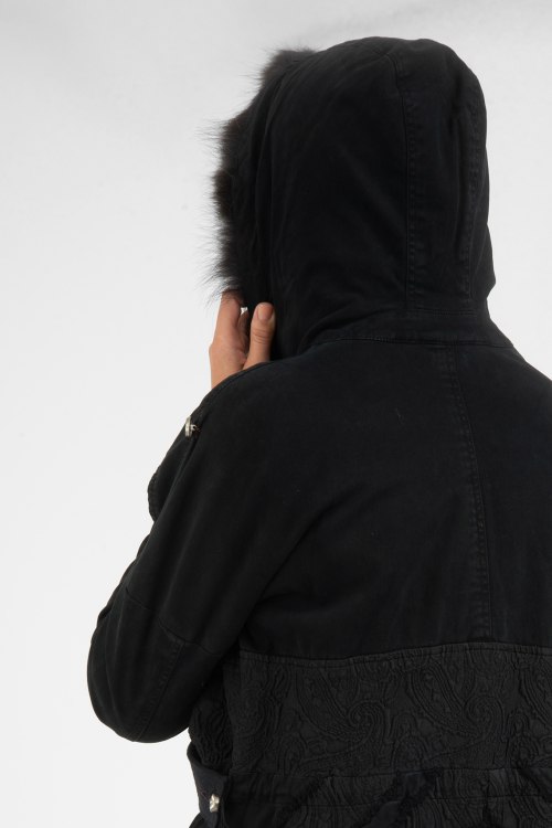 Женская черная зимняя парка из коттонового микса от Project Foce Singleseason (Проджект Фос Синглсизон). Модель с капюшоном, застегивается на металлическую, скрытую молнию, три кармана с клапанами, асимметричный низ, манжеты сзади на пуговицах, съемный трикотажный ремень с пряжкой спереди. Декорирована меховой отделкой и тиснением