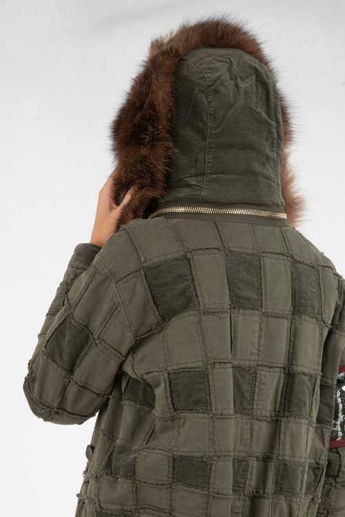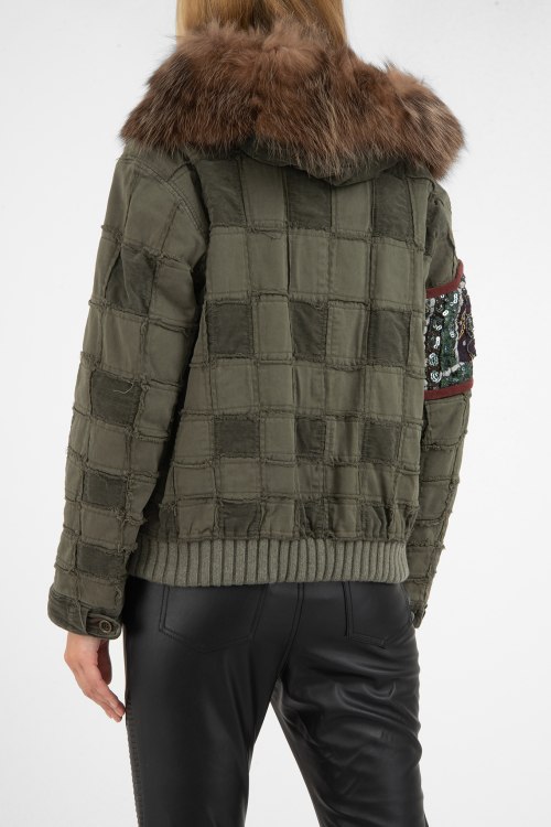 Женский зимний бомбер с капюшоном из коттонового микса от Project Foce Singleseason (Проджект Фос Синглсизон). Укороченная модель, съемный капюшон с меховой отделкой, застегивается спереди на молнию, по бокам карманы с клапанами, манжеты на кнопке, трикотажная резинка внизу изделия. Куртка декорирована геометрическими вставками по всему изделию с необработанными краями и нашивкой на рукаве с бисером.