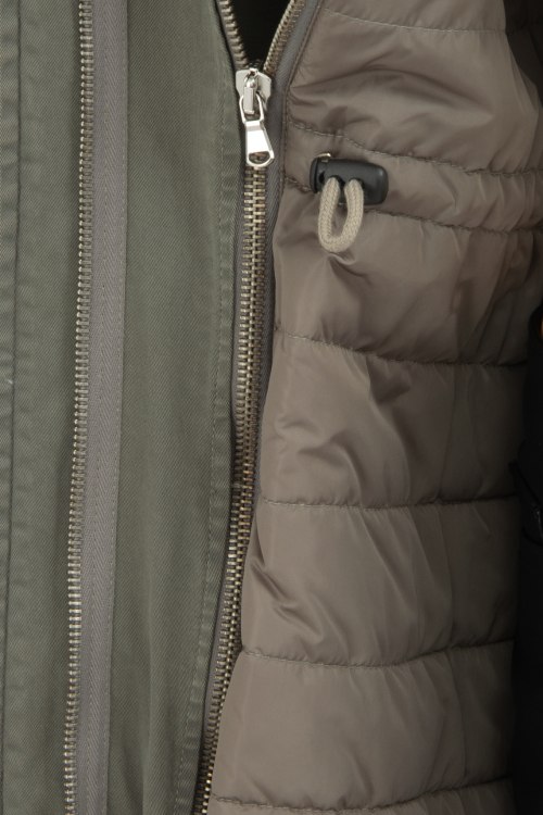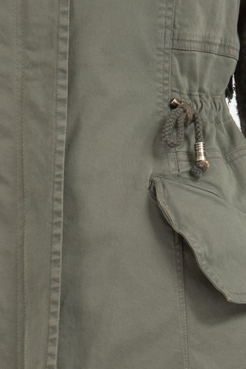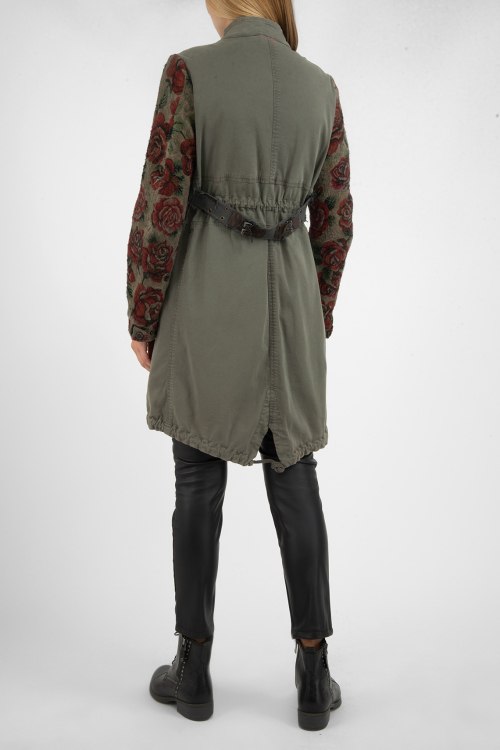 Женская демисезонная парка в цвете хаки от Project Foce Singleseason (Проджект Фос Синглсизон). Модель имеет съемную подкладку на синтепоне, что позволяет летом использовать как тонкую куртку а осенью и весной как утепленную верхнюю одежду. Длина почти до колена, ассиметричный низ, без капюшона, воротник-стойка, застегивается на скрытую молнию под ветрозащитной планкой, кулиска в талии, по бокам карманы с клапаном. Декор: декоративный ремешок на уровне талии по спинке, рукава из плотного суконного трикотажа в цветочный принт