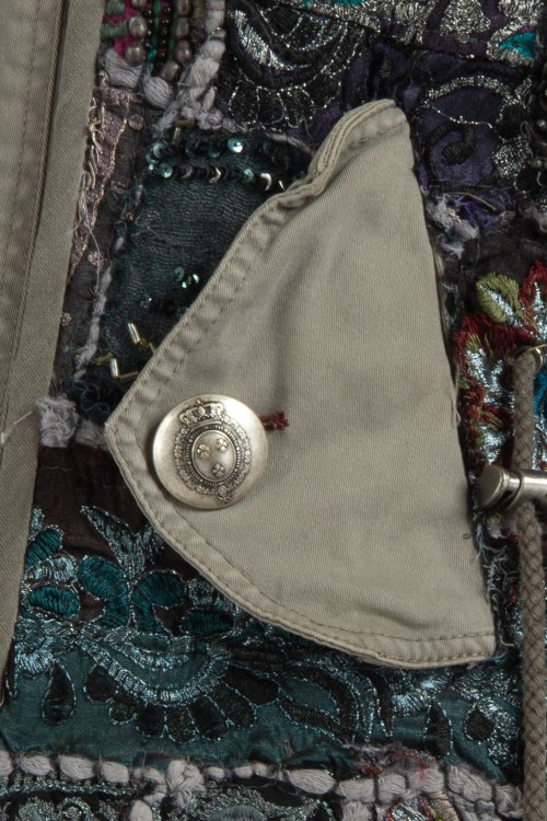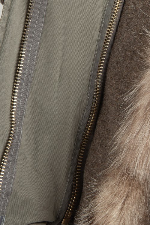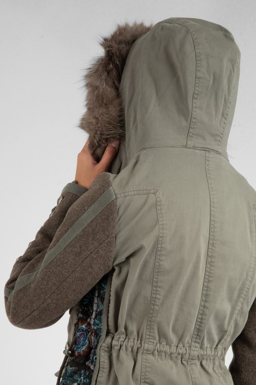 Женская серая парка из коттонового микса и драповыми рукавами от Project Foce Singleseason (Проджект Фос Синглсизон). Укороченная модель с капюшоном, кулиска на талии, по бокам карманы с клапаном. На капюшоне и до середины груди отделка из натурального меха. Перед изделия декорирован вышивкой в этно-стиле.