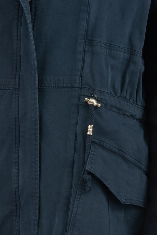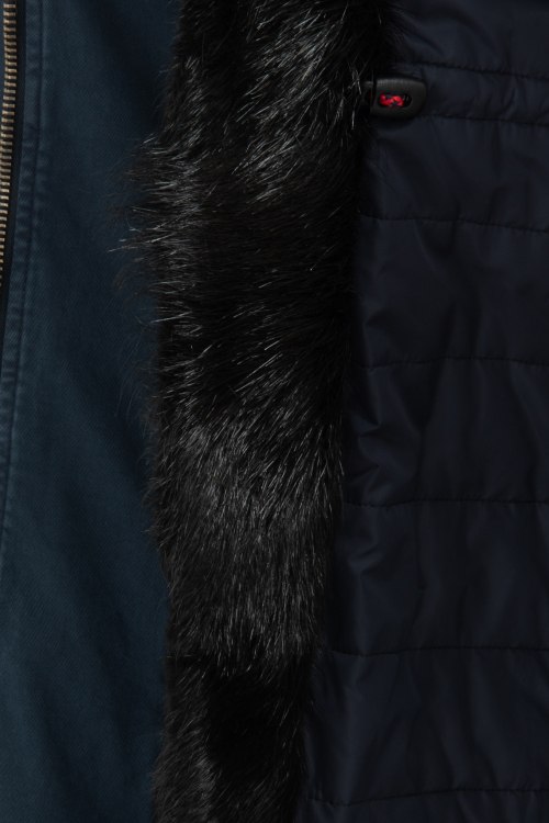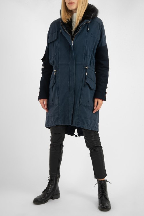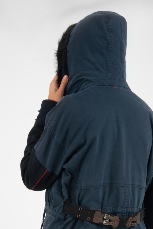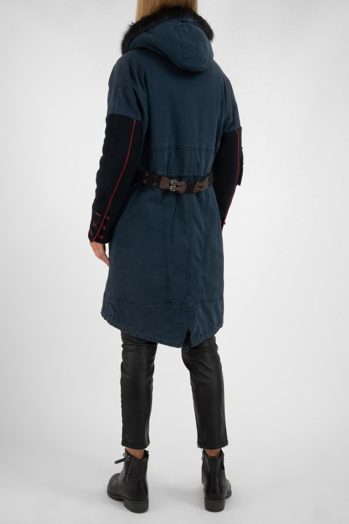 Женская темно-синяя парка из коттонового микса от Project Foce Singleseason (Проджект Фос Синглсизон). Модель с капюшоном, застегивается спереди на скрытую молнии, кулиска на талии, три кармана с клапанами, асимметричный низ, накладной карман на рукаве, ремень сзади. Декорирована меховой отделкой на капюшоне