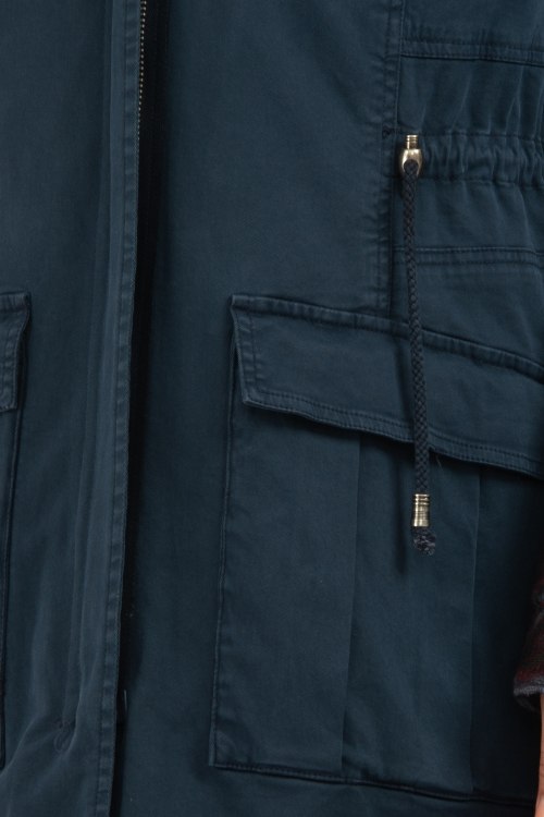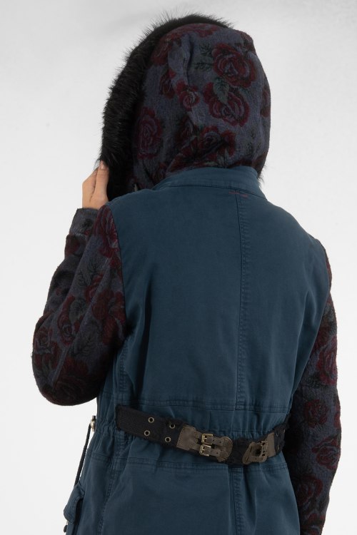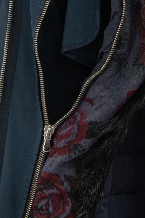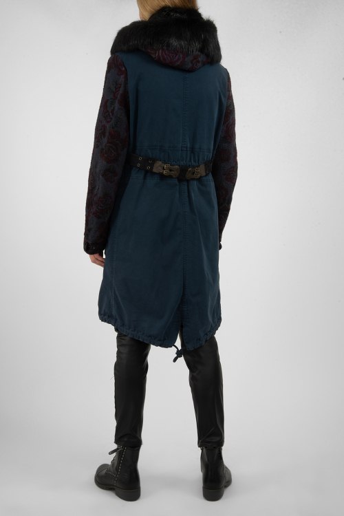 Женская темно-синяя парка из коттонового микса от Project Foce Singleseason (Проджект Фос Синглсизон). Модель с капюшоном, застегивается на скрытую молнию, клапаны на груди, накладные карманы с клапаном по бокам, кулиска на талии, асимметричный низ, манжеты на пуговицах. Декорирована цветочным принтом на рукавах, черной меховой отделкой на капюшоне