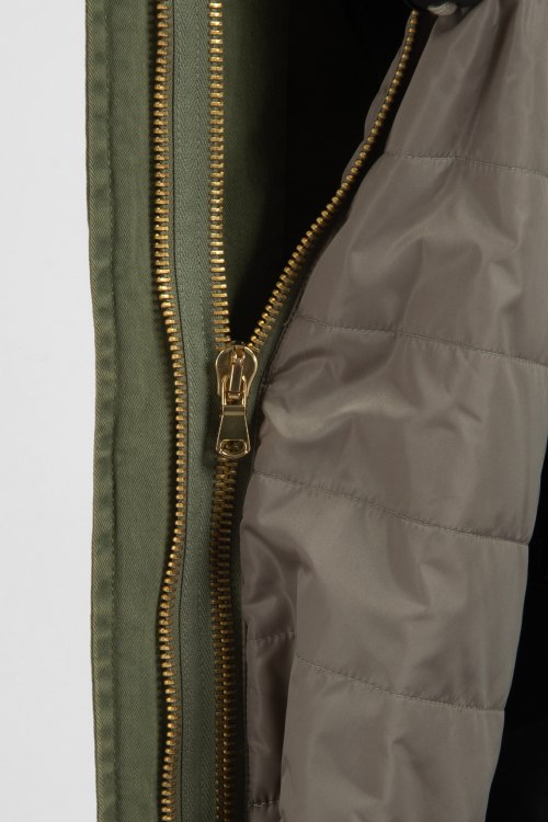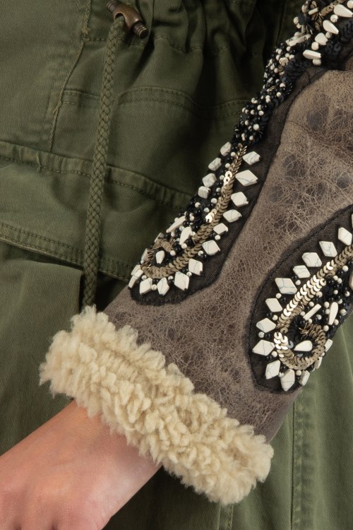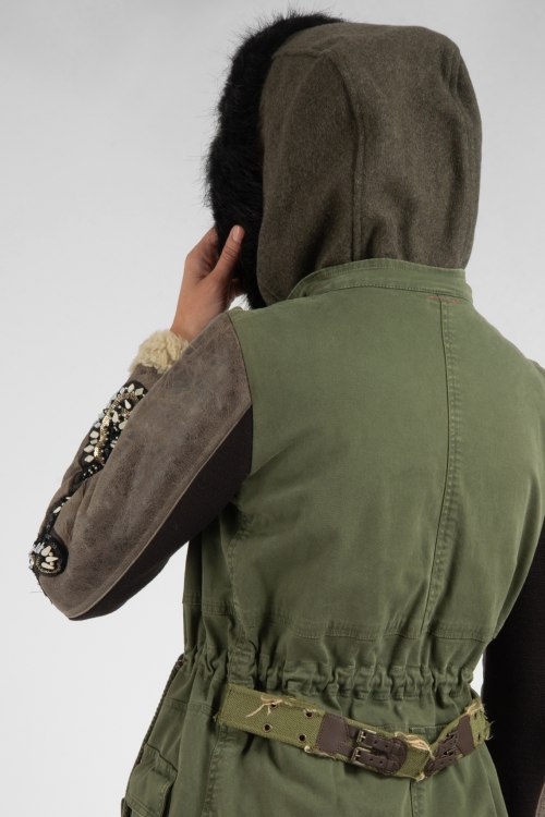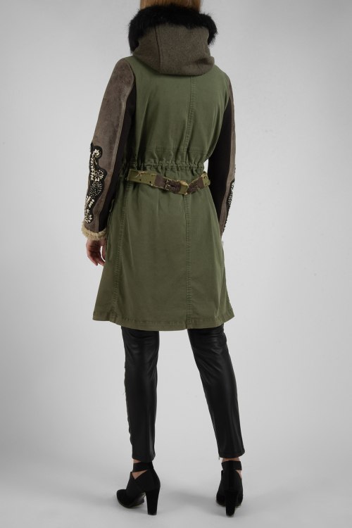 Женская темно-зеленая парка из коттонового микса от Project Foce Singleseason (Проджект Фос Синглсизон). Модель с капюшоном, застегивается спереди на скрытую молнию, два прорезных кармана на груди с клапаном, два кармана накладных с клапаном по бокам, на талии кулиска, контрастные рукава, ремень сзади. Декорирована аппликацией с камнями и бисером на рукавах, меховая отделка на воротнике и капюшоне. Размер вещи на фото: 42