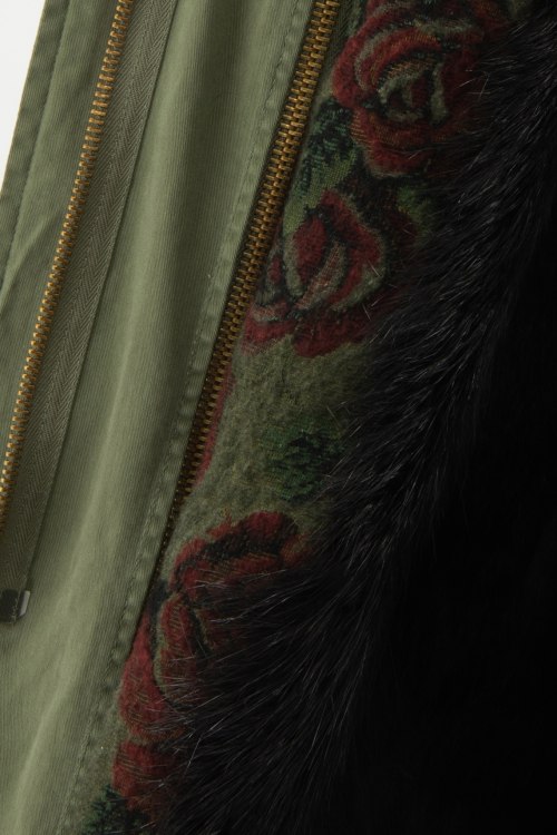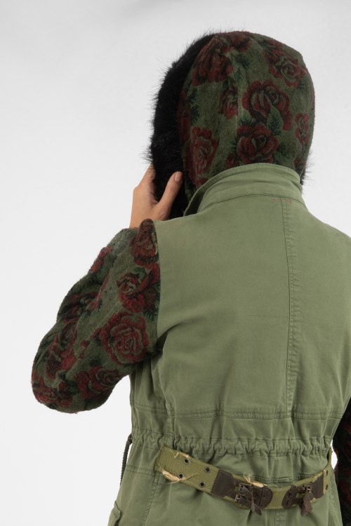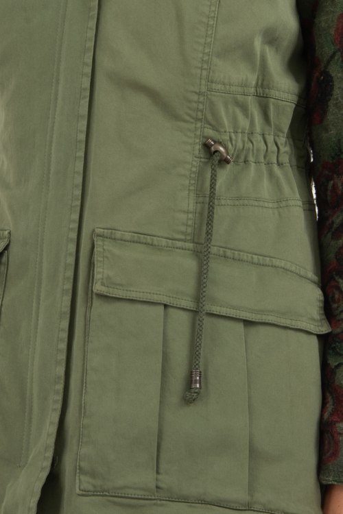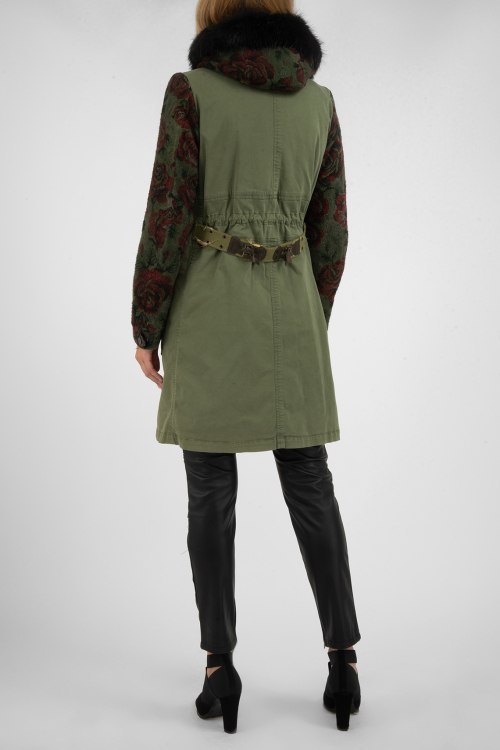 Женская зеленая парка из коттонового микса от Project Foce Singleseason (Проджект Фос Синглсизон). Модель с капюшоном, застегивается на золотистую, скрытую молнию, кулиска на талии, четыре кармана с клапанами, манжеты на кнопках, ремень сзади изделия. Декорирована цветочным принтом на рукавах и черной меховой отделкой на воротнике и капюшоне