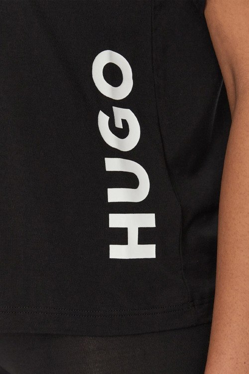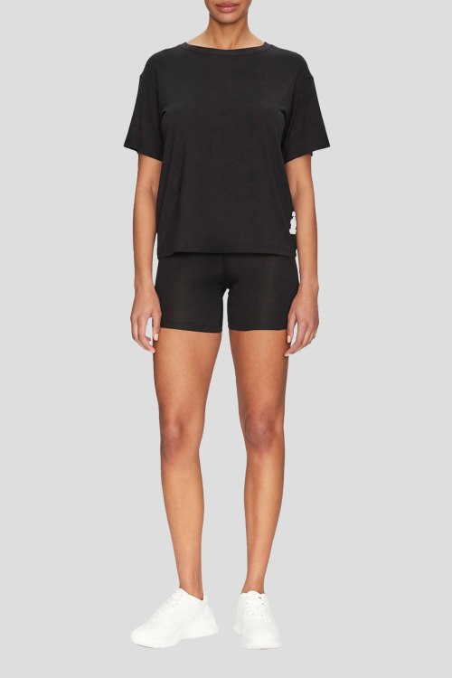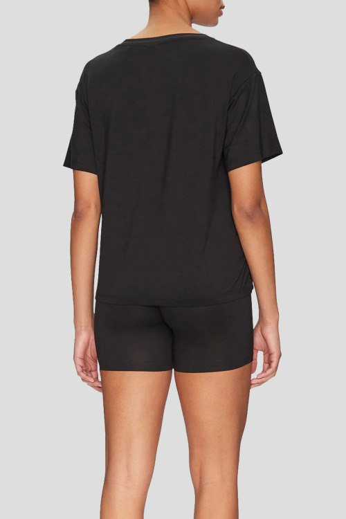 Детали: Женская черная пижама Unite short Set из вискозного микса от Hugo Boss (Хуго Босс). Футболка с круглым вырезом горловины, короткие рукава, логотип бренда, короткие шорты облегающего силуэта, эластичная резинка на поясе