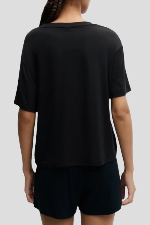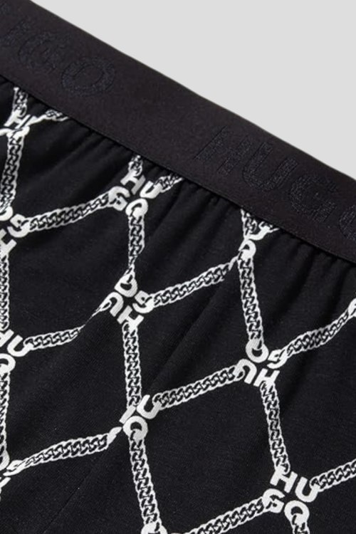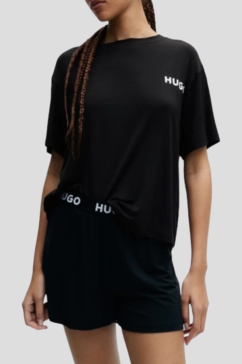 Детали: Женский черный пижамный комплект из вискозы Unite от Hugo by Hugo Boss (Хуго бай Хуго Босс). Футболка: логотип на груди, круглый вырез горловины, короткий рукав, классическая длина. Шорты: эластичный пояс с логотипом, короткая длина