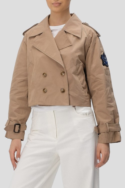 Детали: Женский бежевый тренч из полиэстера и хлопка от Ermanno Ermanno Scervino (Эрманно Эрманно Шервино). Укороченная модель, отложной воротник, двубортная модель, застежка на пуговицы, брендированная нашивка, эластичная вставка сзади по низу изделия, прорезные карманы