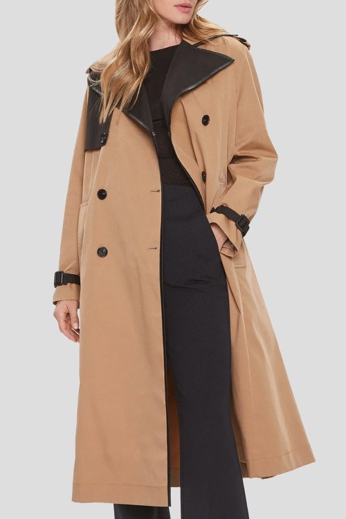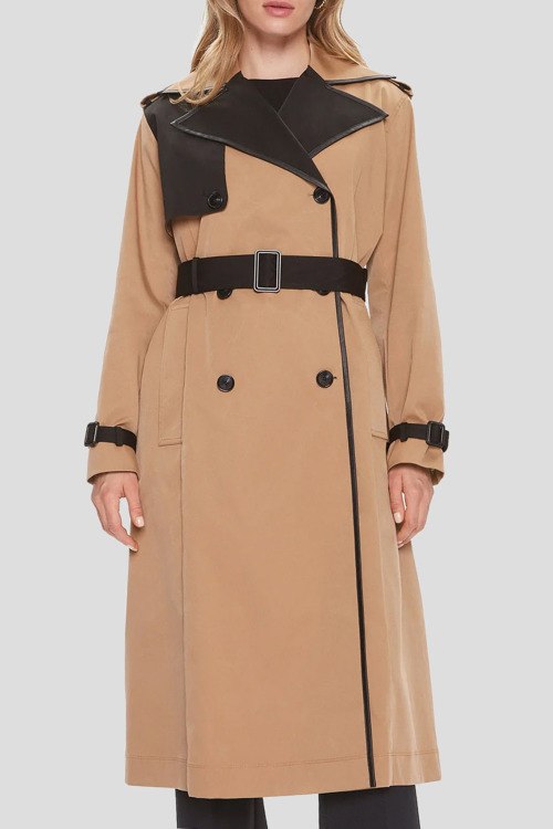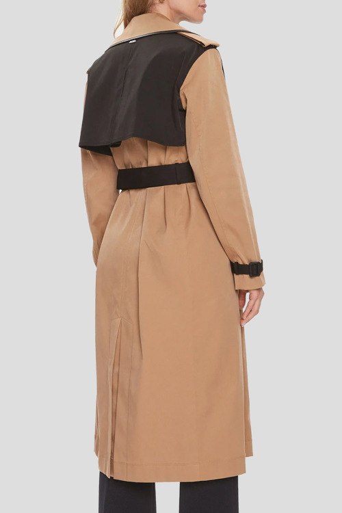 Женский бежевый тренч Caduca из полиамида от Hugo Boss (Хуго Босс). Двубортная модель, отложной воротник,застежка на пуговицы, контрастный пояс, прорезные карманы, патч-лого