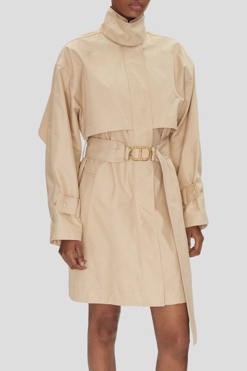Детали: Женский бежевый хлопковый тренч от TWINSET (Твинсет). Высокий воротник с застежкой на две кнопки, боковые карманы, в талии пояс с металлической пряжкой Oval T, скрытая застежка на молнию и кнопки, длина выше колен