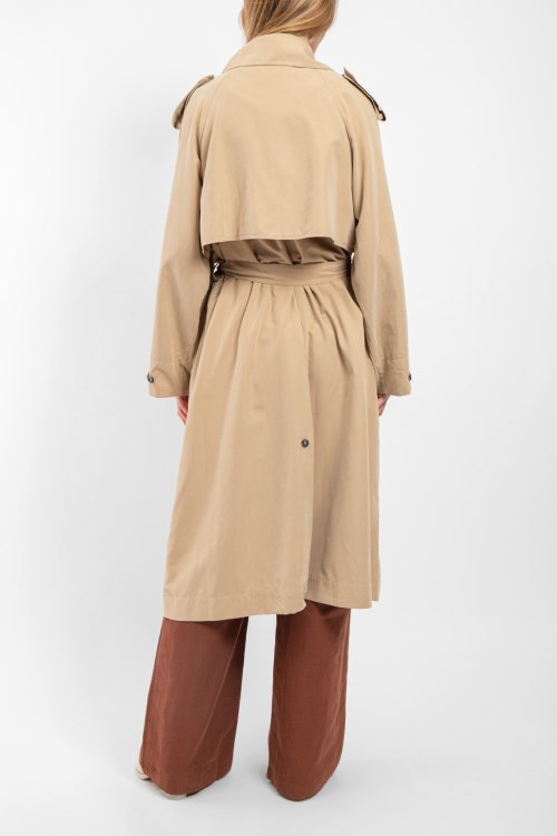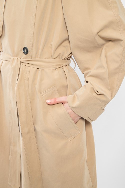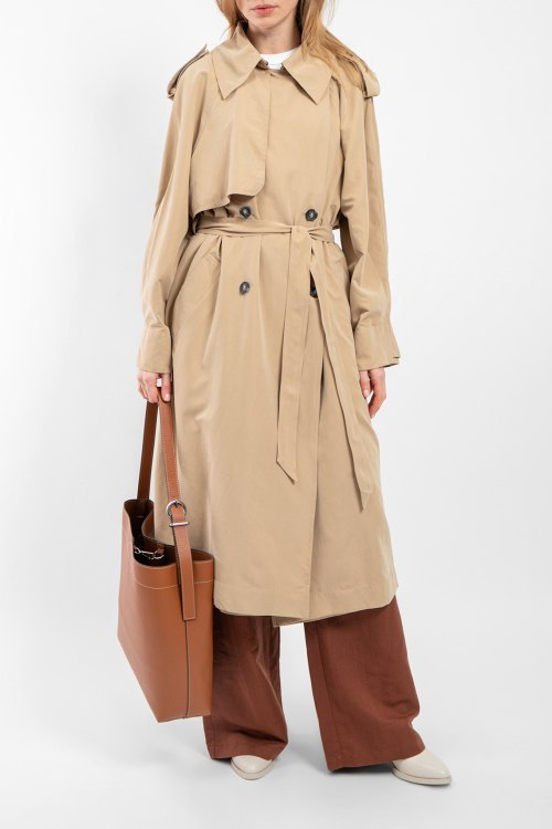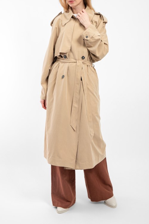 Женский бежевый тренч от Yerse (Йерс). Двубортный фасон, отложной воротник, в талии с поясом, боковые карманы, застежка на пуговицы, длина-миди.