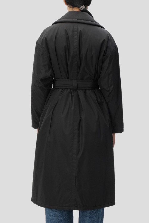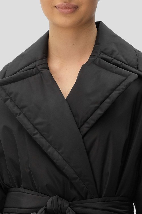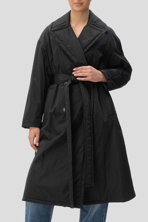Детали: Женский черный плащ из полиэстера от Hugo by Hugo Boss (Хуго бай Хуго Босс). Двубортная модель, отложной воротник, застежка на пуговицы, пояс в тон изделия, прорезные карманы