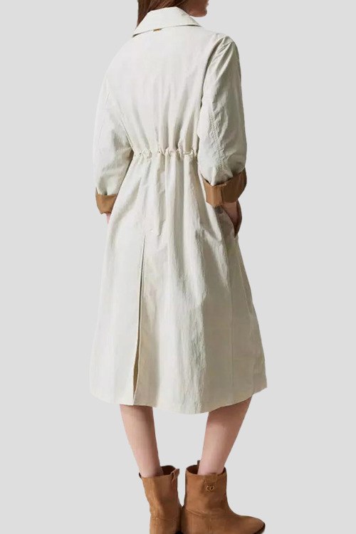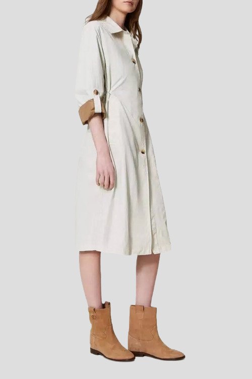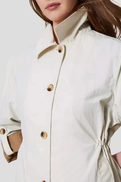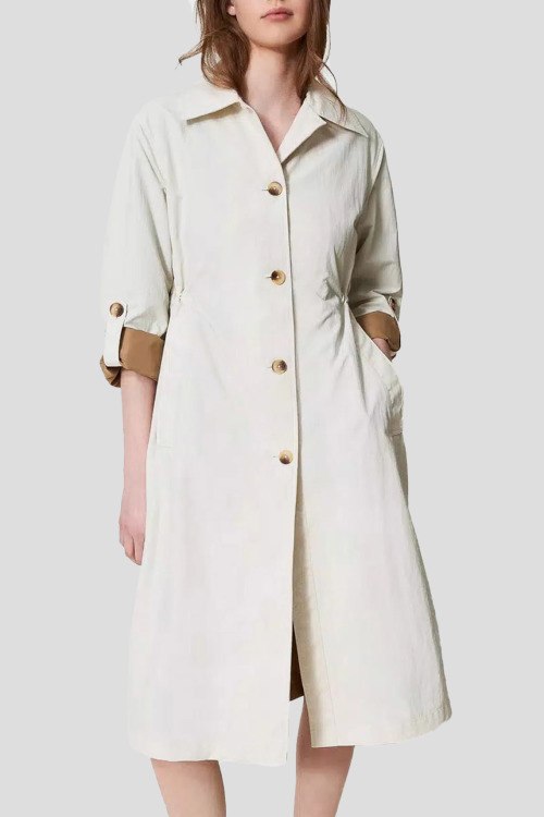 Детали: Женский кремовый нейлоновый тренч от TWINSET (Твинсет). Отложной воротник, боковые карманы, длина рукава 3/4, застежка на пуговицы, длина-миди