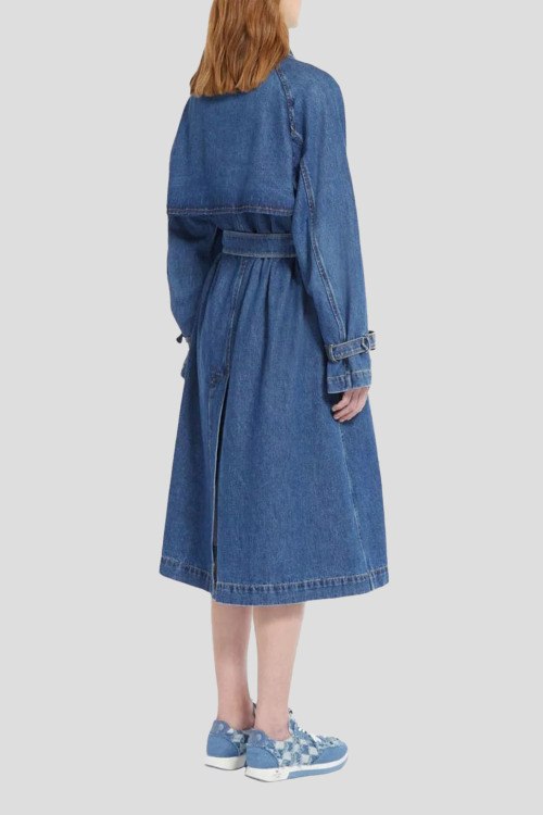 Детали: Женский синий джинсовый плащ из хлопка от Max Mara (Макс Мара). Длина миди, двубортная застежка, отложной воротник, прорезные карманы, пояс в тон изделия