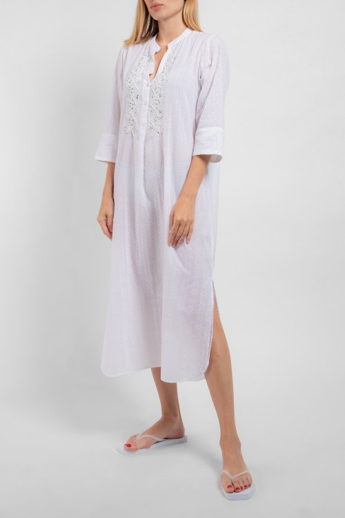 Женское белое платье-рубашка из натурального хлопка от Antica Sartoria (Антика Сарториа). Свободный крой, длина - макси, рукава 3/4, круглый вырез под горло, разрезы по бокам. Застегивается спереди на пуговицы. Декорировано вышивкой в тон изделия.