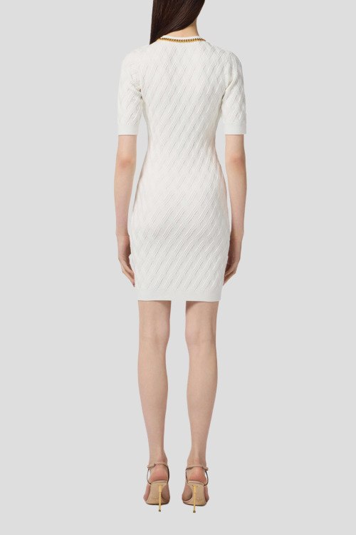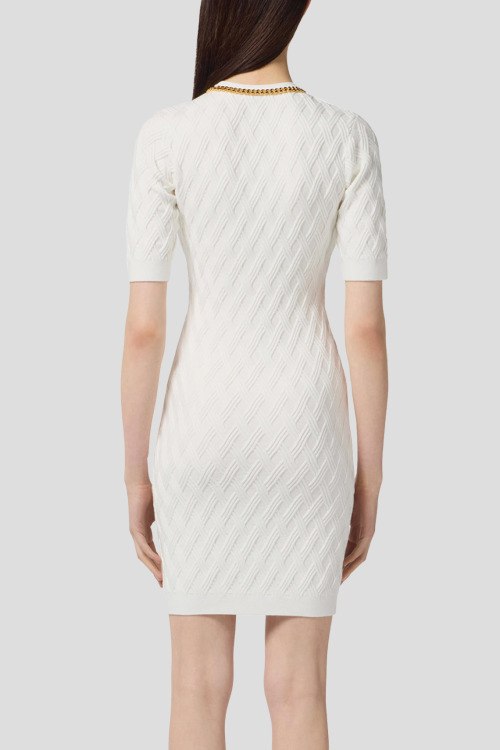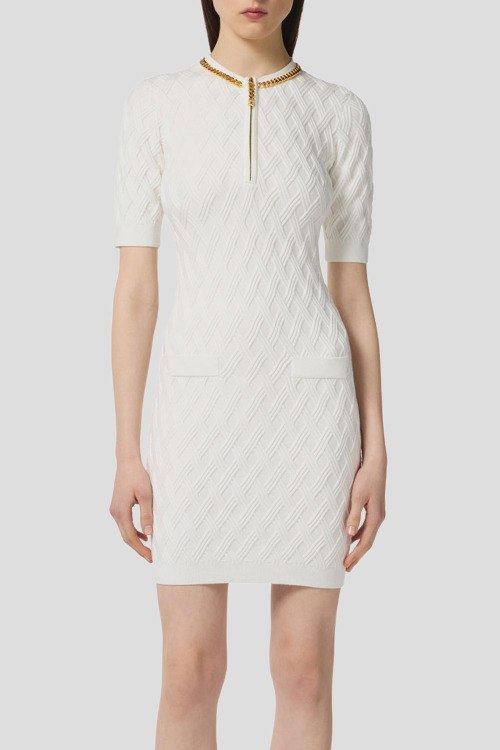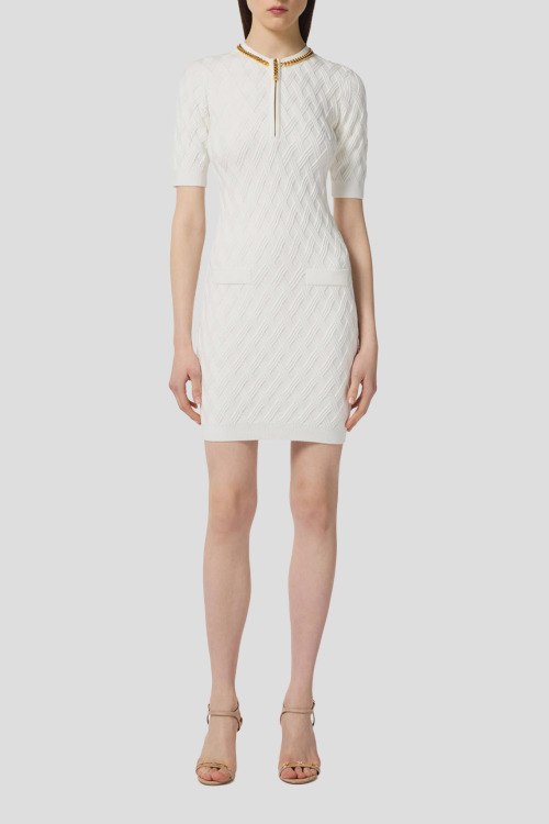 Детали: Женское белое трикотажное платье от Elisabetta Franchi (Елизабетта Франчи). Облегающее платье из трикотажа. Модель с круглым вырезом горловины и рукавами выше локтя отличается изысканным рельефным геометрическим узором в ромбы по всей длине. Дизайн изделия завершает застежка-молния с роскошным пулером в виде логотипа на горловине, украшенной цепочкой панцирного плетения