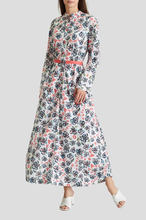Детали: Женское белое платье-рубашка из хлопка от Armani (Армани). Длина макси, приталенный фасон, воротник-стойка, застежка на пуговицы спереди, длинные рукава, накладной карман на груди, цветочный принт
