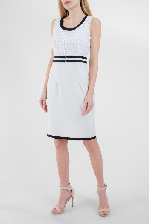 Женское белое платье из микса вискозы от Nissa (Нисса). Длина миди, круглый вырез горловины, без рукавов, на спине застежка молния, внизу разрез, завышенная талия, контрастная окантовка, верх с ажурным узором.