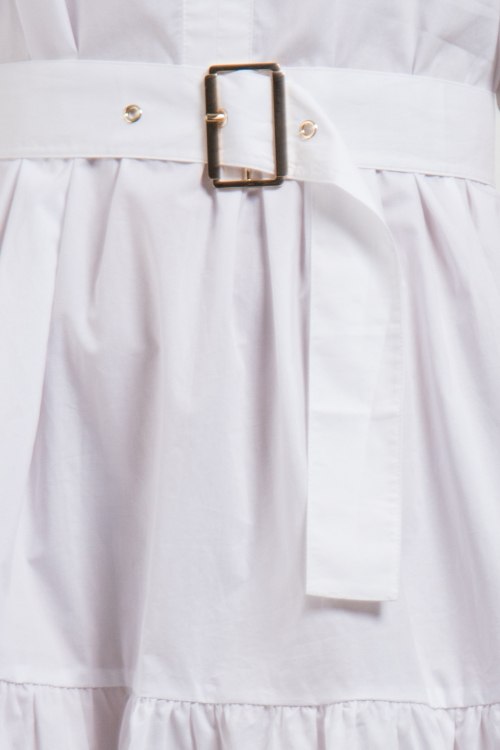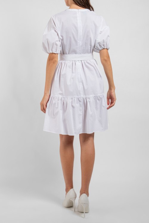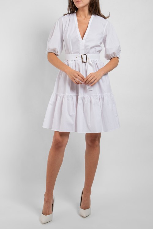 Детали: Женское белое хлопковое платье от Pinko (Пинко). V-образный вырез декольте, короткий рукав, в талии с поясом, расклешенная юбка, длина выше колен
