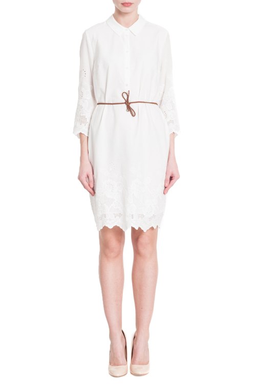 Детали: Однотонное платье средней длинны с рукавами 3/4, декорировано вставками кружева, поясом и отложным воротничком.