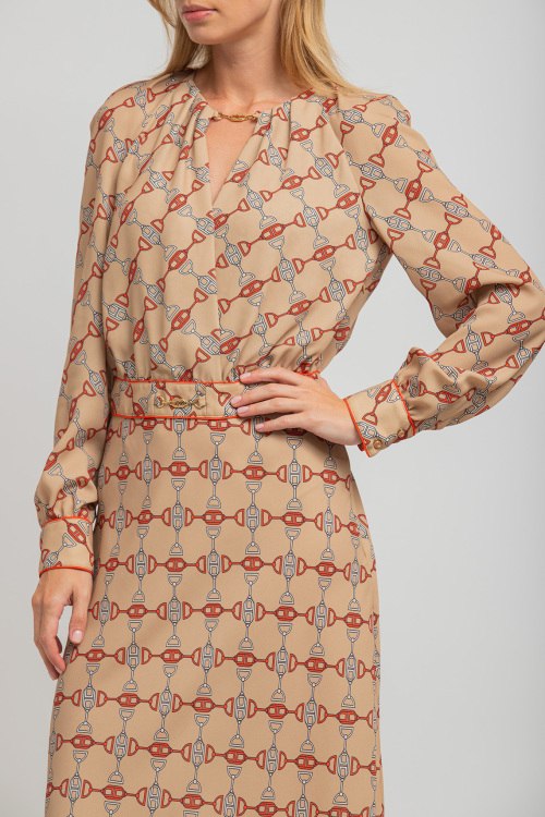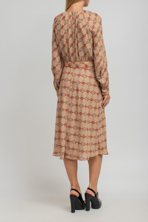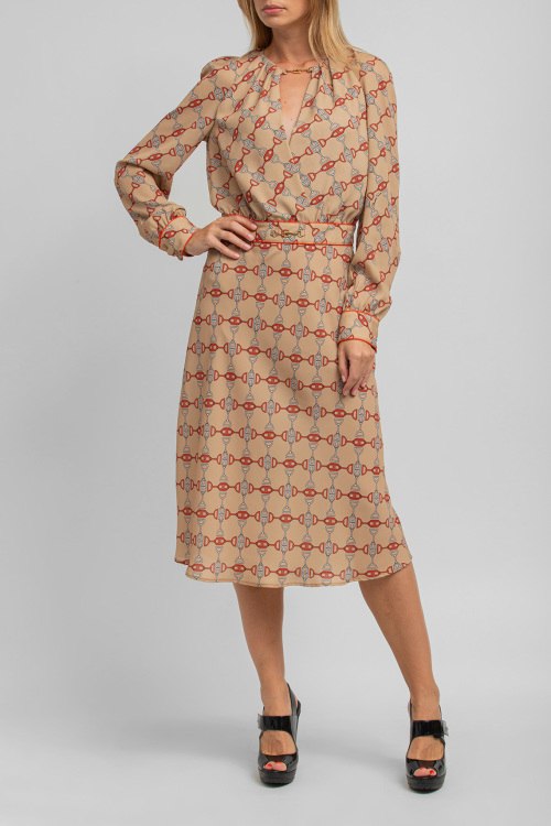 Женское бежевое платье от Elisabetta Franchi (Елизабетта Франчи). Принт Horsebit по всей поверхности, V-образный вырез, длинный рукав, длина-миди.