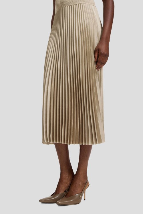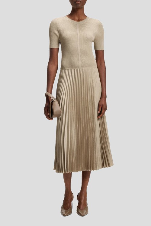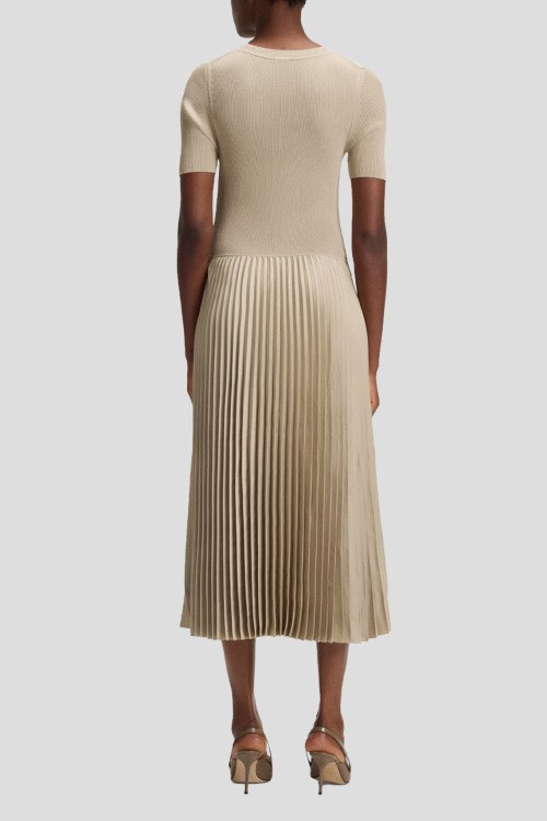 Детали: Женское бежевое платье Fadridi от Hugo Boss (Хуго Босс). Круглый вырез горловины, короткий рукав, плиссированная юбка, длина-миди