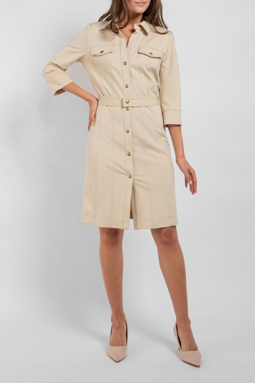 Женское бежевое платье-рубашка из вискозного микса от Pinko (Пинко). Классический воротник, два накладных кармана на груди, укороченный рукав с манжетами, в талии с поясом, юбка А-силуэта, застегивается на кнопки по всей длине, длина до колен.