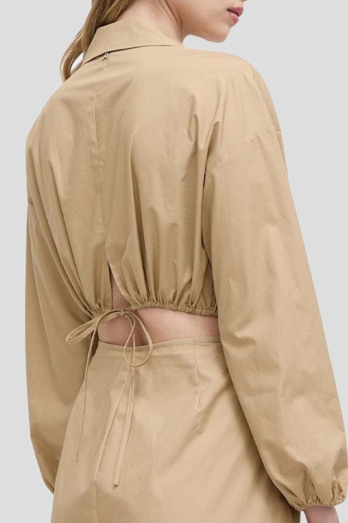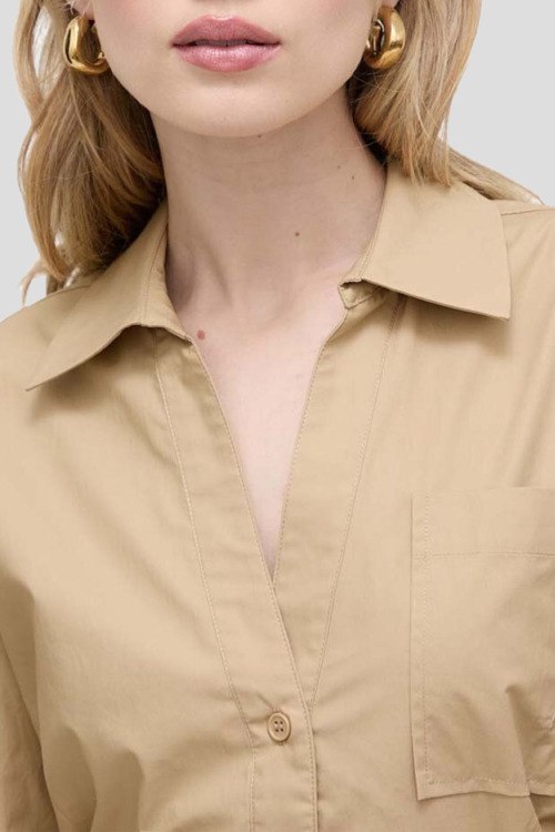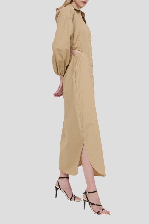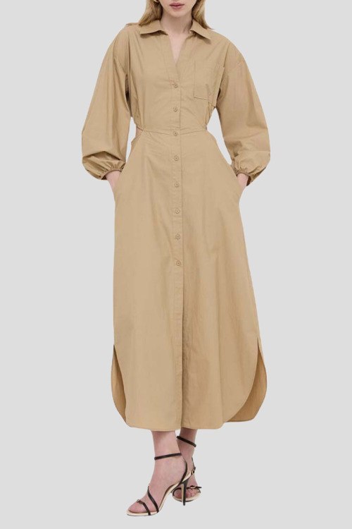 Детали: Женское бежевое хлопковое платье-рубашка от TWINSET (Твинсет). Отложной воротник, накладной карман на груди с вышитым логотипом, длинный широкий рукав, застежка на пуговицы спереди по всей длине, боковые карманы, вырез сзади на талии, разрезы по бокам, длина-миди