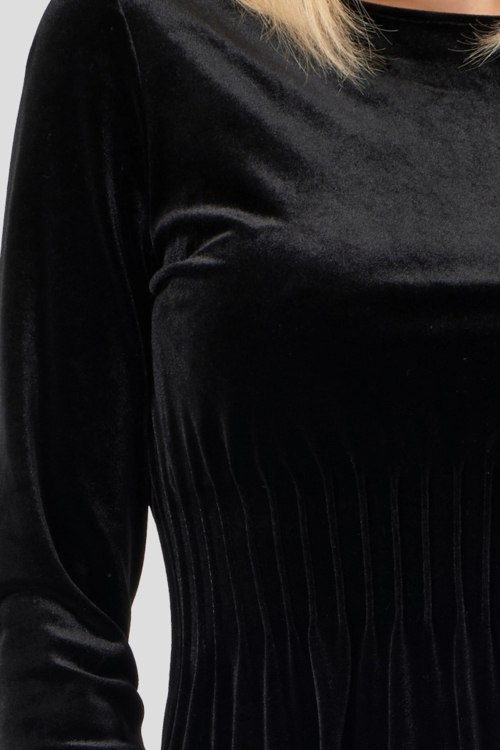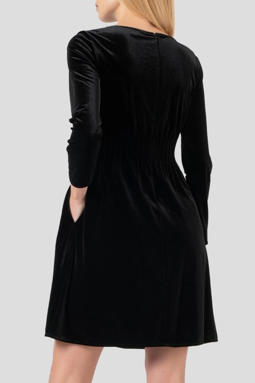 Детали: Женское черное вельветовое платье от Emporio Armani (Эмпорио Армани). Круглый вырез горловины, длинный рукав, боковые карманы, застежка-молния на спине, короткая длина