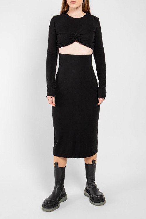 Детали: Женское черное платье из вискозы от Dsquared2 (Дискваред). Длина миди, круглый вырез горловины, на спине застежка-молния, длинные рукава, приталенный силуэт, драпировка, дизайн с глубоким вырезом спереди, ровный подол