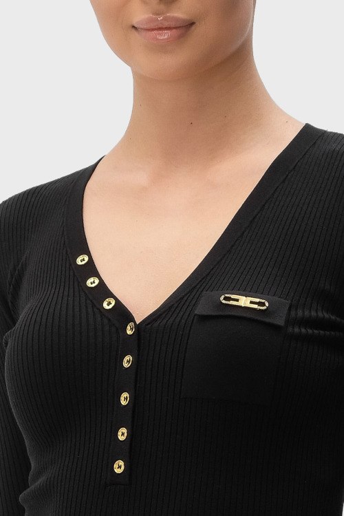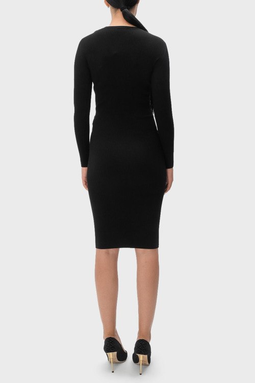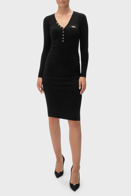 Детали: Женское черное платье из лиоцелла от Elisabetta Franchi (Елизабетта Франчи). Логотип на груди, V-образный вырез, застежка на пуговицы, длинный рукав, облегающий фасон, длина до колен