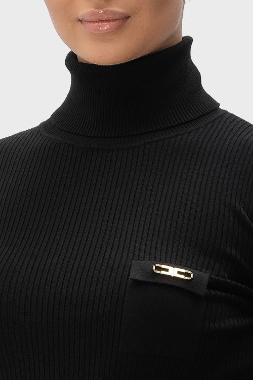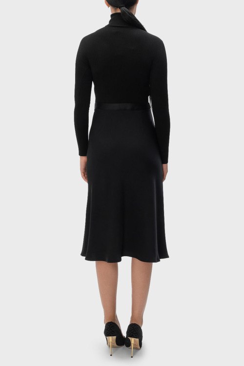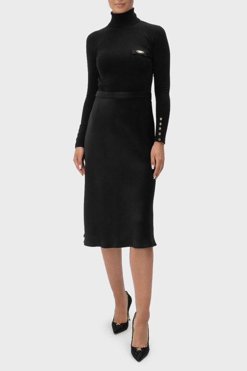 Детали: Женское черное платье-миди из лайкры и шелка от Elisabetta Franchi (Елизабетта Франчи). Трикотажный верх, высокая горловина, логотип на груди, длинный рукав, атласная юбка, длина-миди