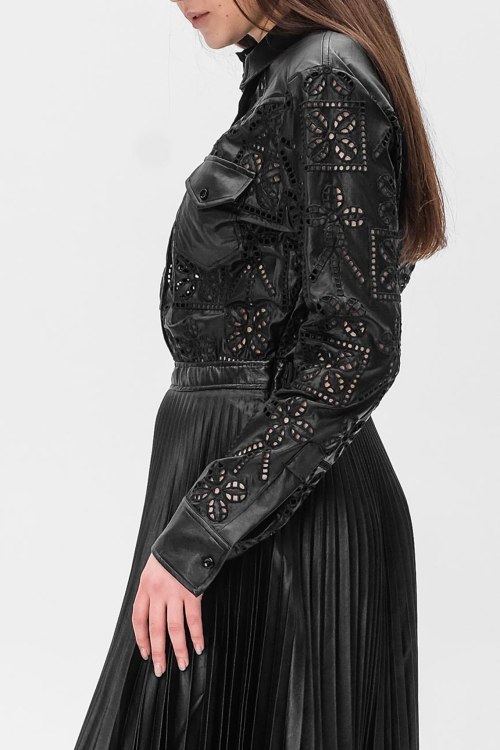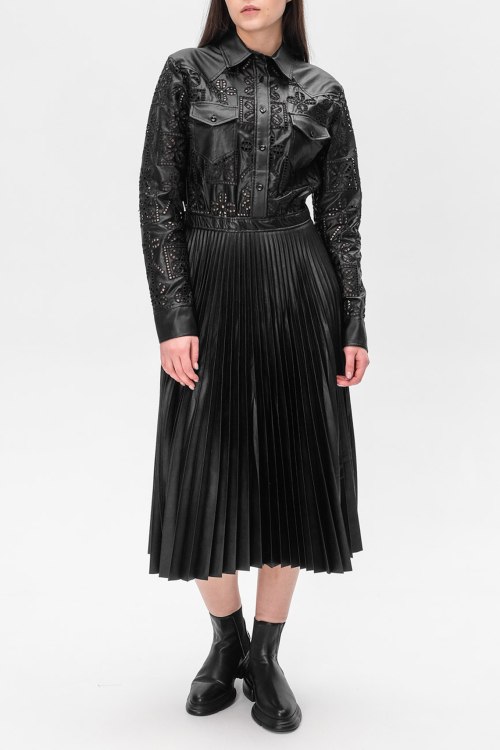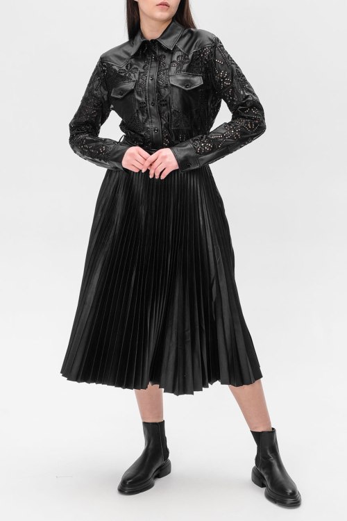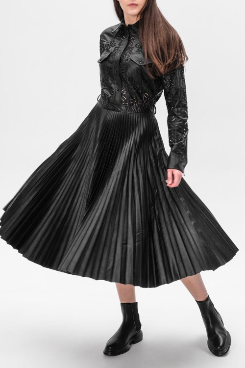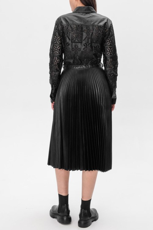 Детали: Женское черное платье из полиэстера от Ermanno Scervino (Эрманно Шервино). Длина миди, длинные рукава, отолжной воротник, застегивается на пуговицы, плиссированная юбка